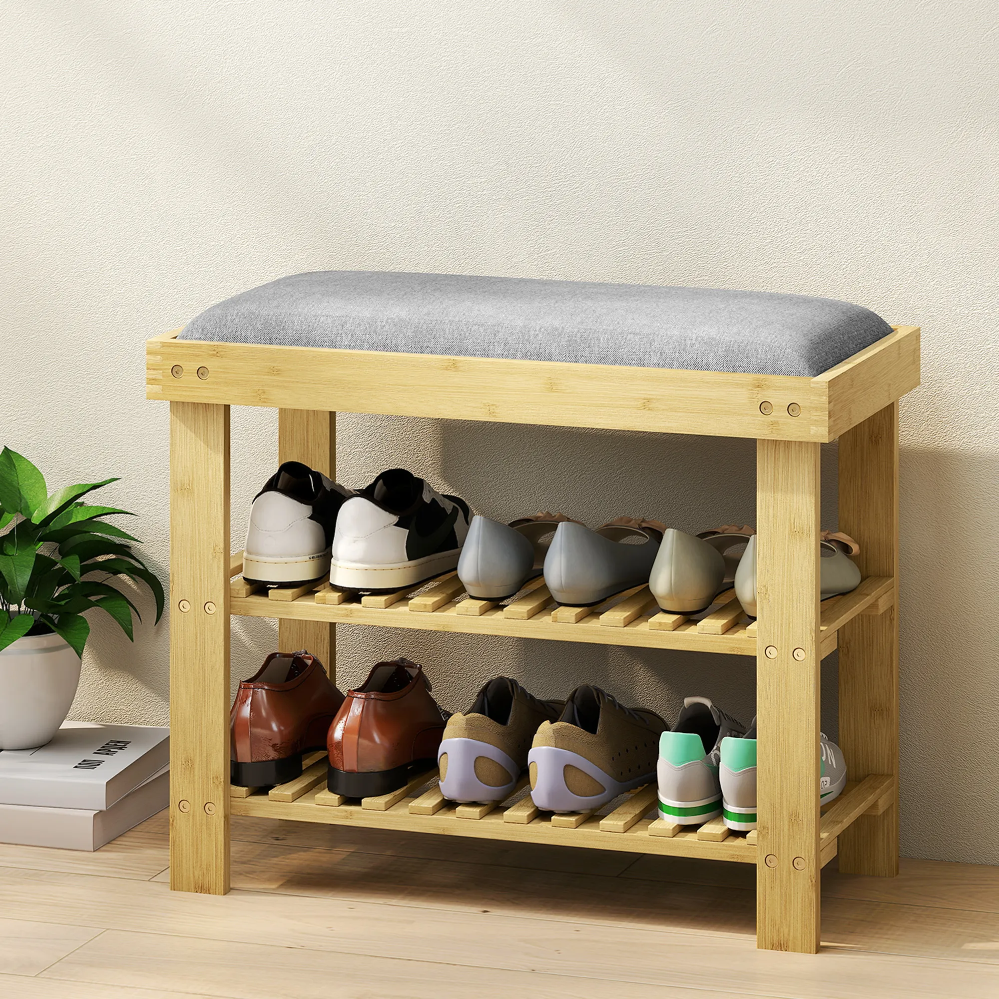Schoenenbank Met Zitvlak, Bamboe Zitbank Met Opbergruimte, 2 Open Vakken, Zitbank 60 X 29 X 49 Cm Grijs
