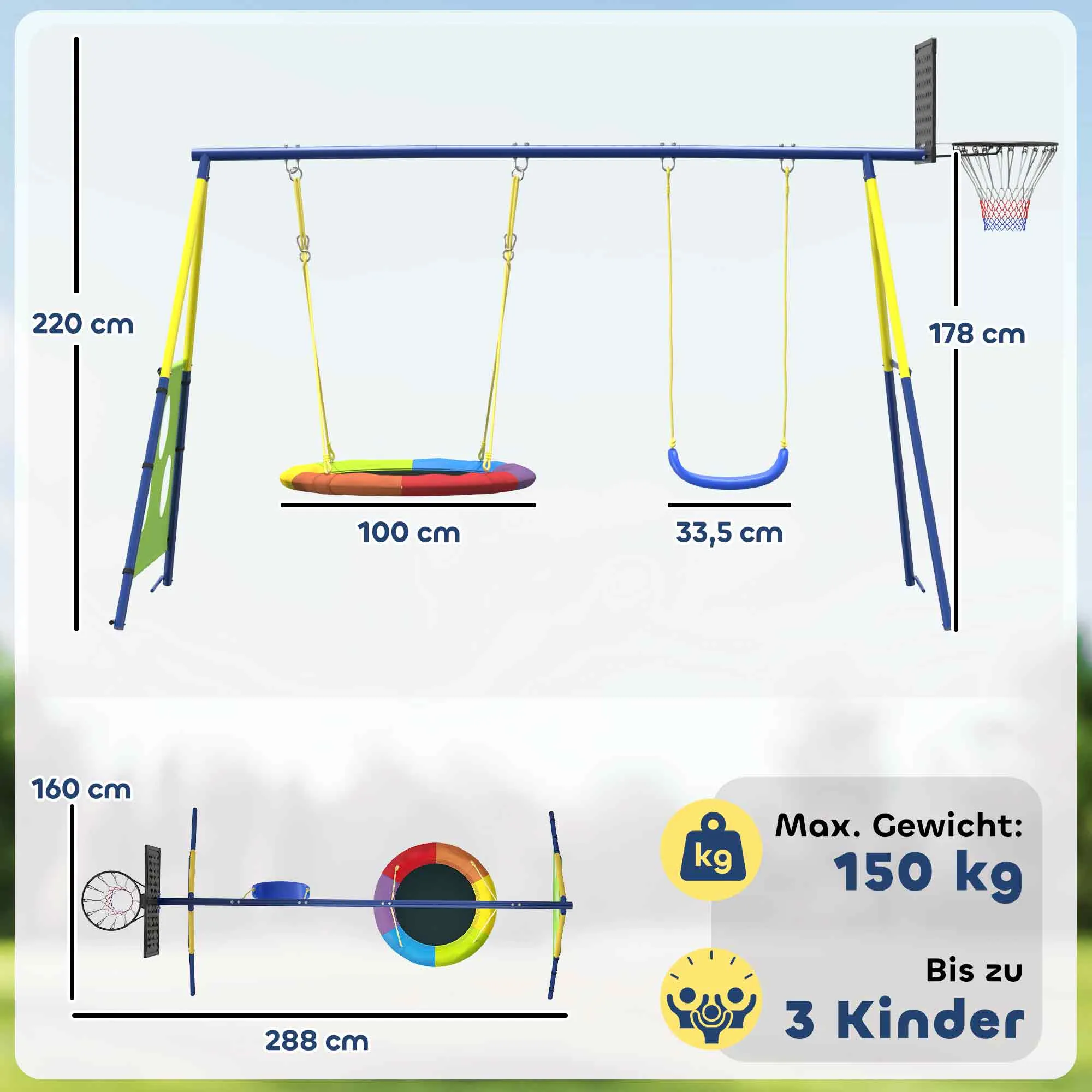 • Veelzijdig plezier: bevat een nestschommel, U-schommel, basketbal- en voetbaldoel voor eindeloos vermaak