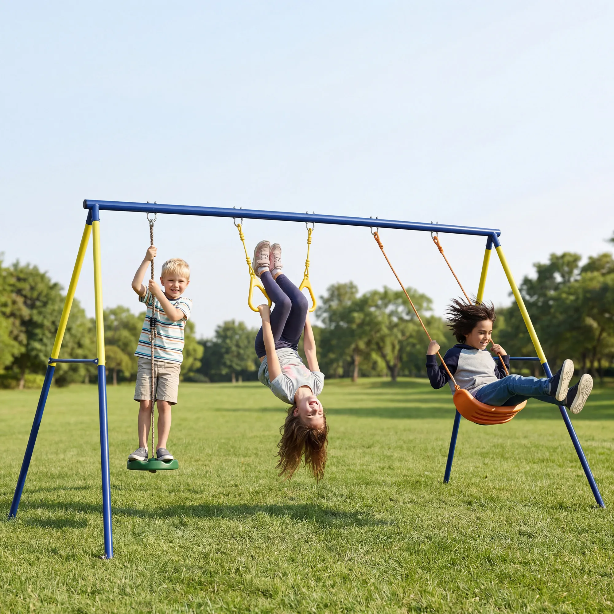Voeg energie en plezier toe aan je tuin met de [BRAND NAME] kinderschommel. Dit stevige stalen frame maakt veilig spelen voor maximaal drie kinderen mogelijk. De weerbestendige materialen zorgen ervoor dat je langdurig kunt genieten van buitenspeelplezier. Creëer onvergetelijke herinneringen vol speelplezier, lachen en zorgeloze vreugde in de buitenlucht.