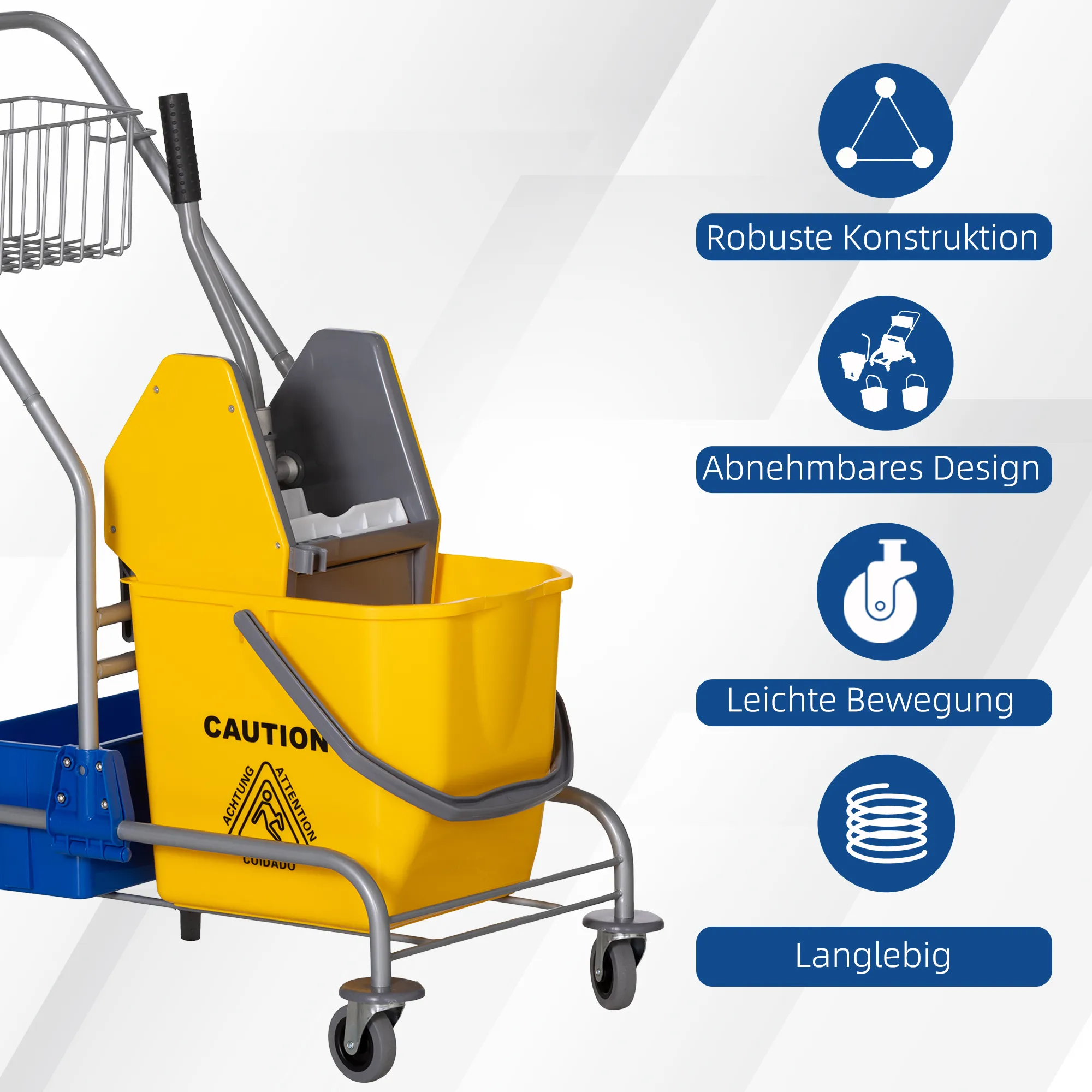 De [BRAND NAME] schoonmaakwagen met pers is de ideale partner voor professioneel vloeronderhoud. Gemaakt van hoogwaardig kunststof, staat deze schoonmaakwagen garant voor duurzaamheid en stevigheid. Met een ruime 25L emmer, een handige kunststof plank en een opbergmandje is deze wagen eenvoudig te manoeuvreren. Dankzij de vier wielen en de ergonomische handgreep kan je hem moeiteloos verplaatsen.