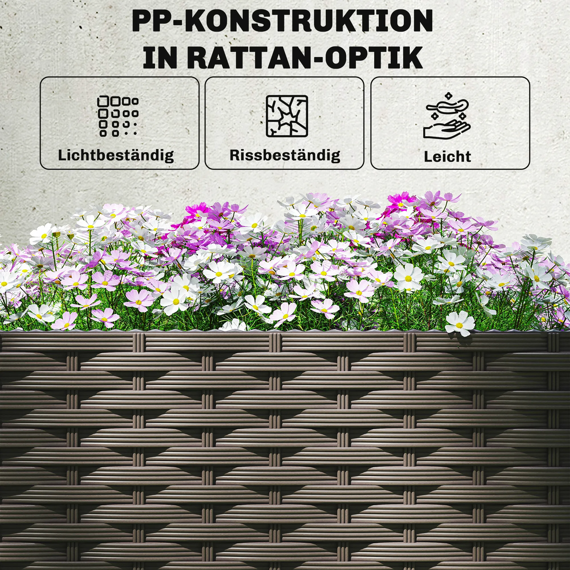 Wil je ruimtebesparend tuinieren met een slim irrigatiesysteem? Dan is de [BRAND NAME] bloembak met klimrek de perfecte oplossing voor jou! Met een automatische timer voor handsfree irrigatie tot 4 uur lang, afvoergaten en waterreservoirs voor optimale vochtigheid, en een stijlvolle rattan-look, geeft deze plantenbak met klimrek elk terras of balkon een esthetische upgrade.