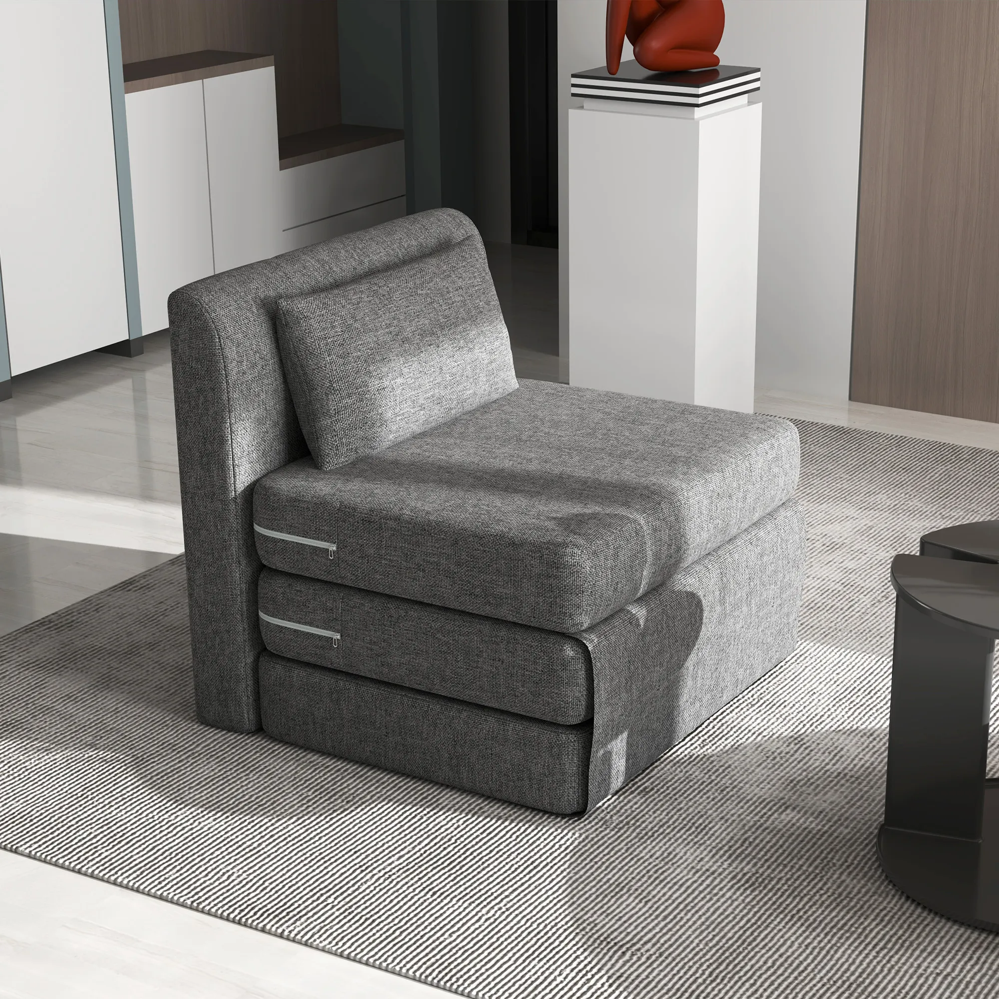 Ontdek het comfort en de veelzijdigheid van onze innovatieve TRUUSK vloerstoel! Dit ruimtewonder kan worden gebruikt als een comfortabele stoel of een praktisch eenpersoonsbed voor overnachtende gasten. Met zijn slimme ontwerp en de dikke bekleding van de vloersofa is hij ideaal voor filmavonden, gaming-marathons of gewoon om te ontspannen. Compact en toch comfortabel, onze slaapstoel brengt vreugde en ontspanning in jouw huis.