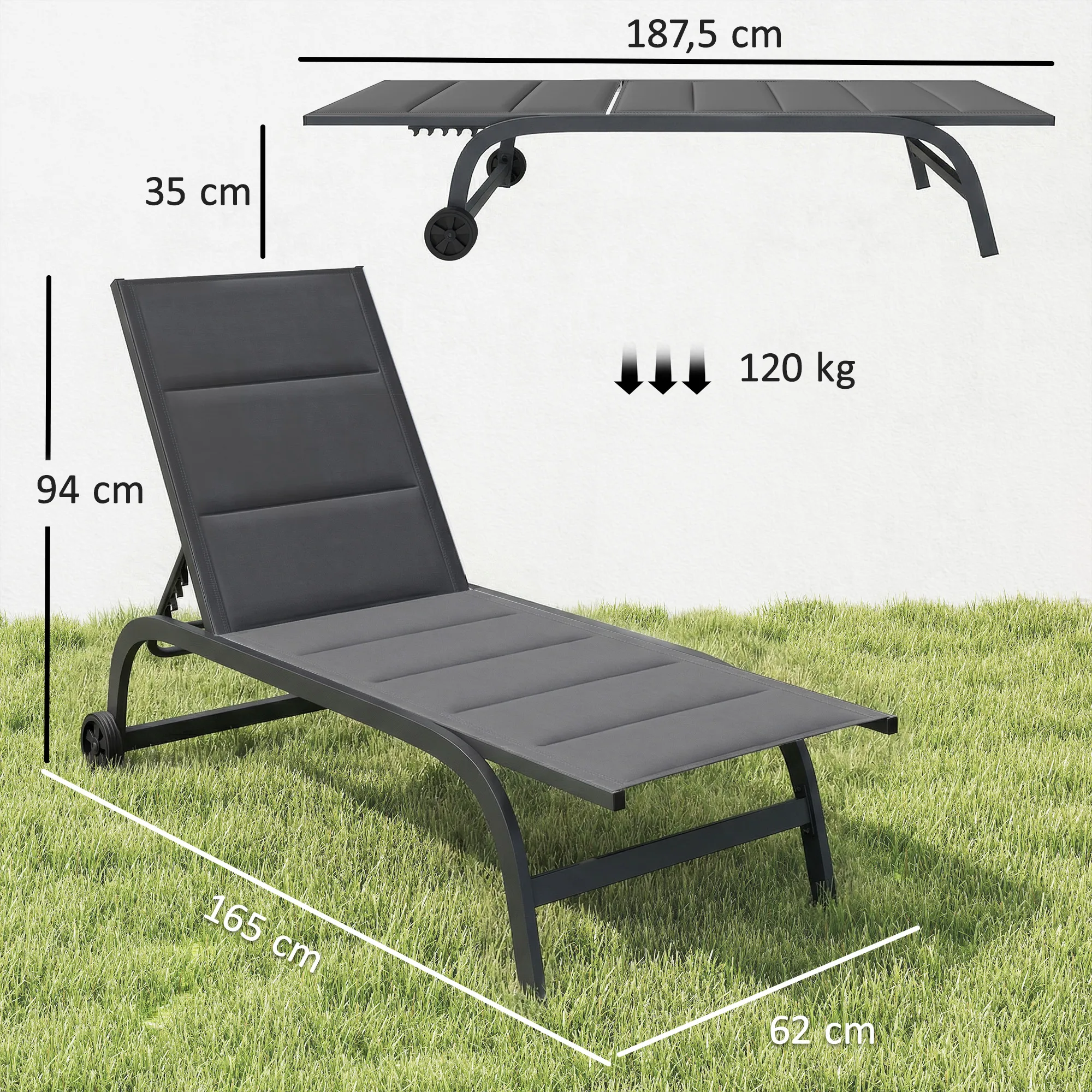 Sonnenliege Ademende Tuinligstoel Met 6-voudig Verstelbare Rugleuning Wielen Aluminium Frame Donkergrijs