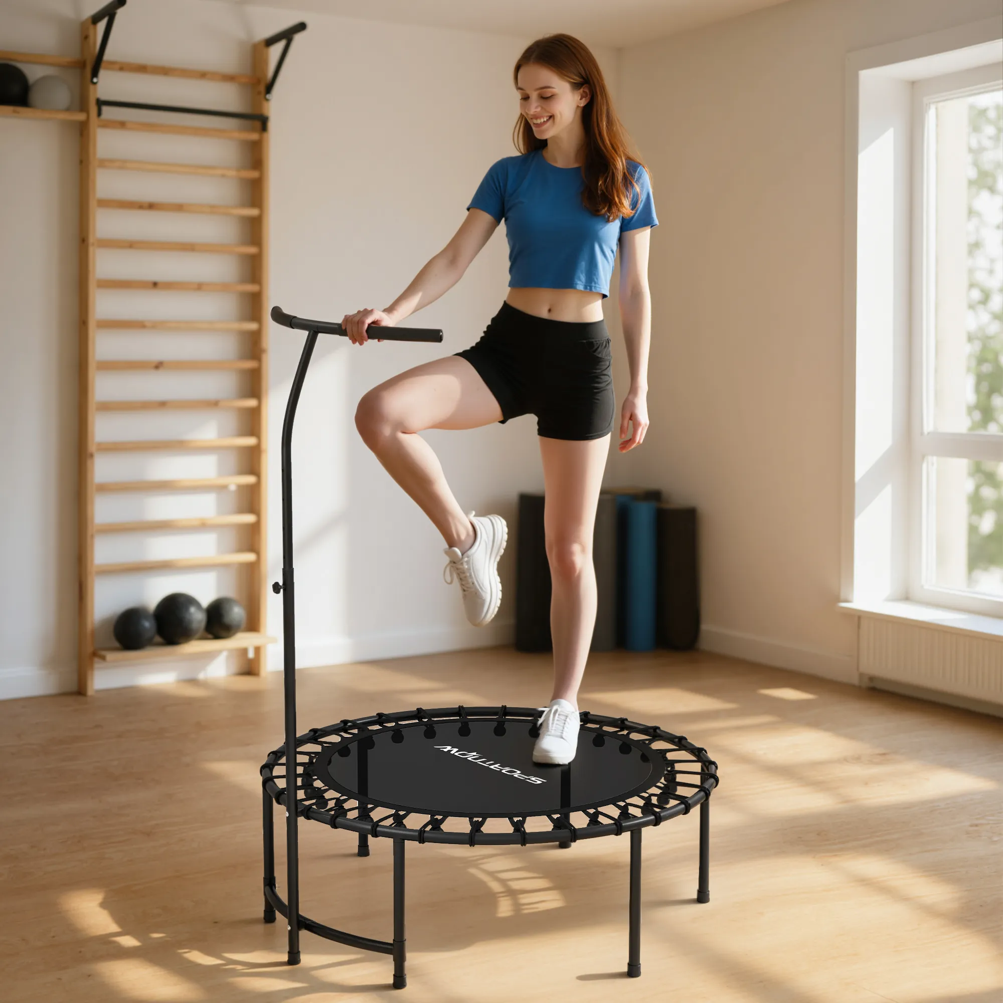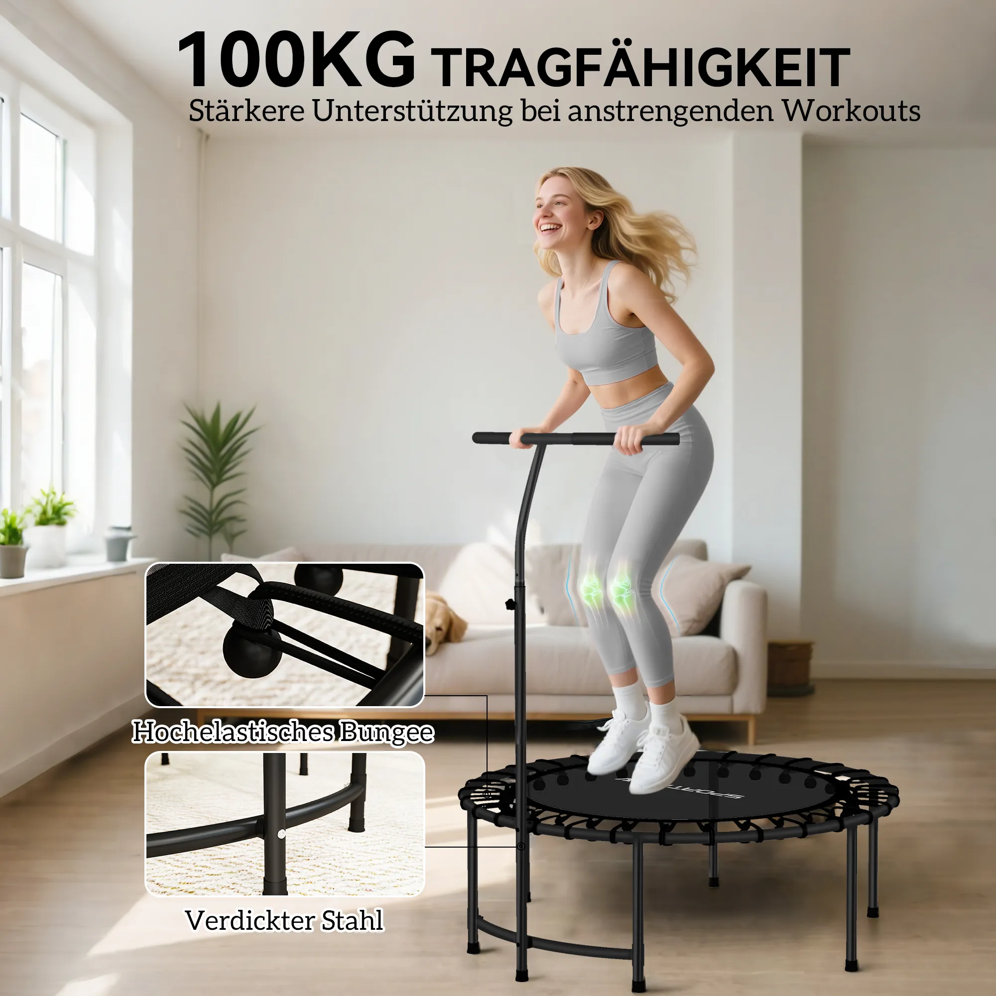 Dompel jezelf onder in een plezierige en gezonde training met de SPORTNOW fitness trampoline voor volwassenen. Deze fitness trampoline is ideaal voor full-body training thuis en biedt 36 bungees voor een rustige en gewrichtsvriendelijke sprong. Het stabiele stalen frame kan tot 100 kg dragen. De in hoogte verstelbare T-vormige handgreep zorgt voor stabiliteit bij elke sprong, terwijl de antislipvoetjes je vloeren beschermen. Perfect voor cardio, balans en krachttraining.