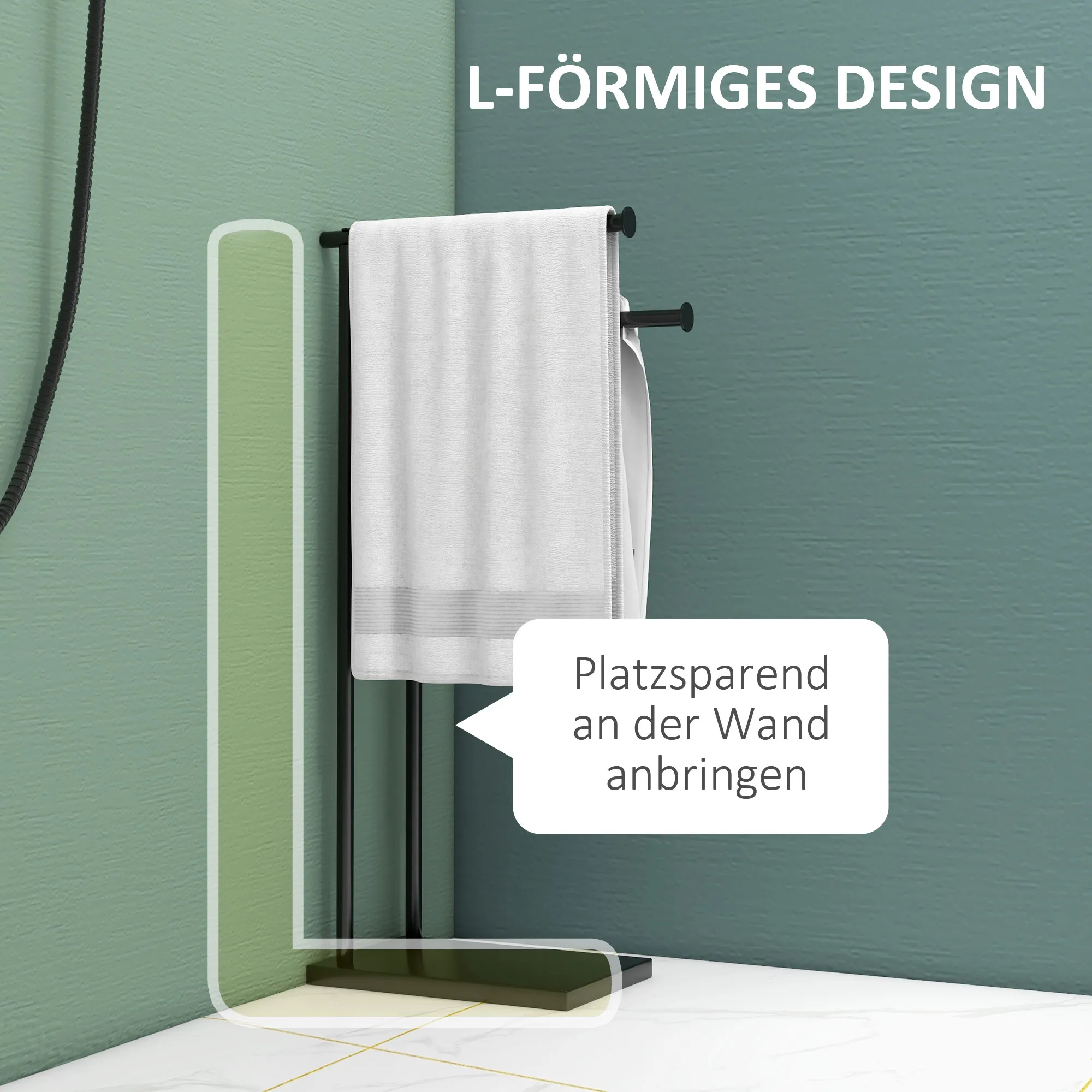 Hang je handdoeken op aan deze stijlvolle [BRAND NAME] badhanddoekhouder met 2 stangen. Het L-vormige ontwerp van de vrijstaande handdoekhouder met verschillende hoogtes en 13 cm afstand organiseert je handdoeken ruimtebesparend. De zware basis met antislipvoetjes zorgt voor stabiliteit, zelfs op gladde vloeren. Dankzij het vrijstaande ontwerp kan de handdoekhouder flexibel en gemakkelijk worden geplaatst en verplaatst.