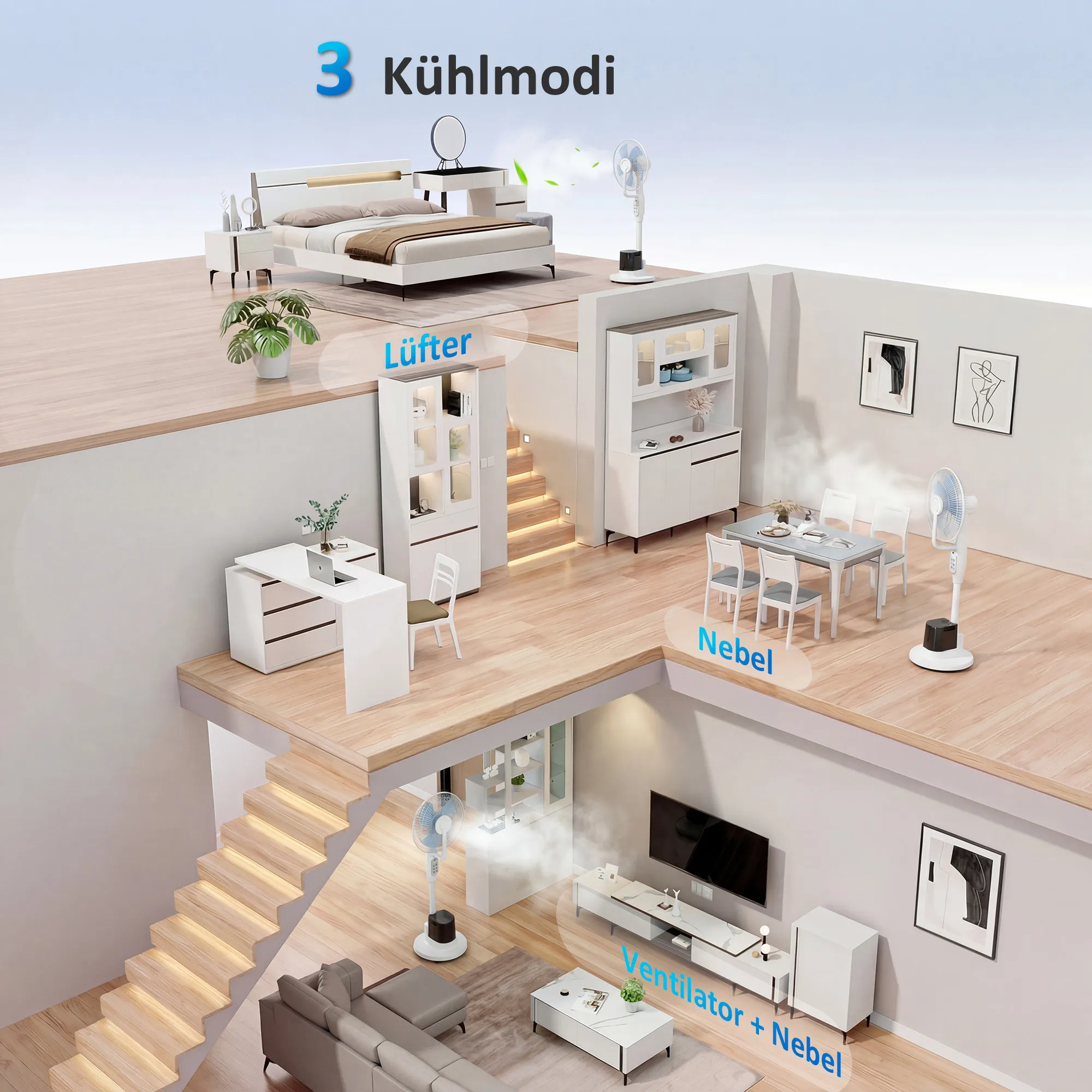 - Koel nevel en sterke luchtstroom: verfrissende verkoeling voor de hele dag