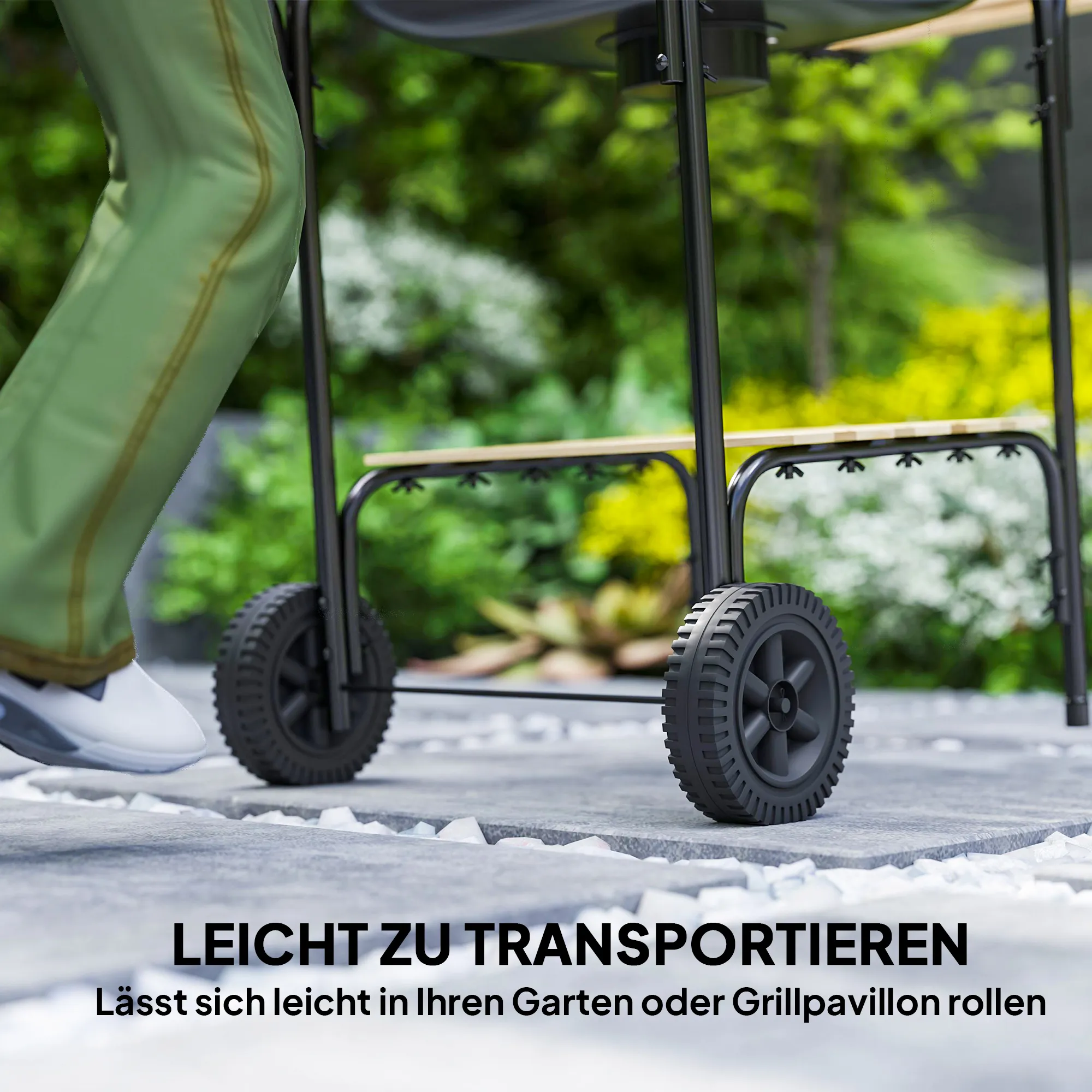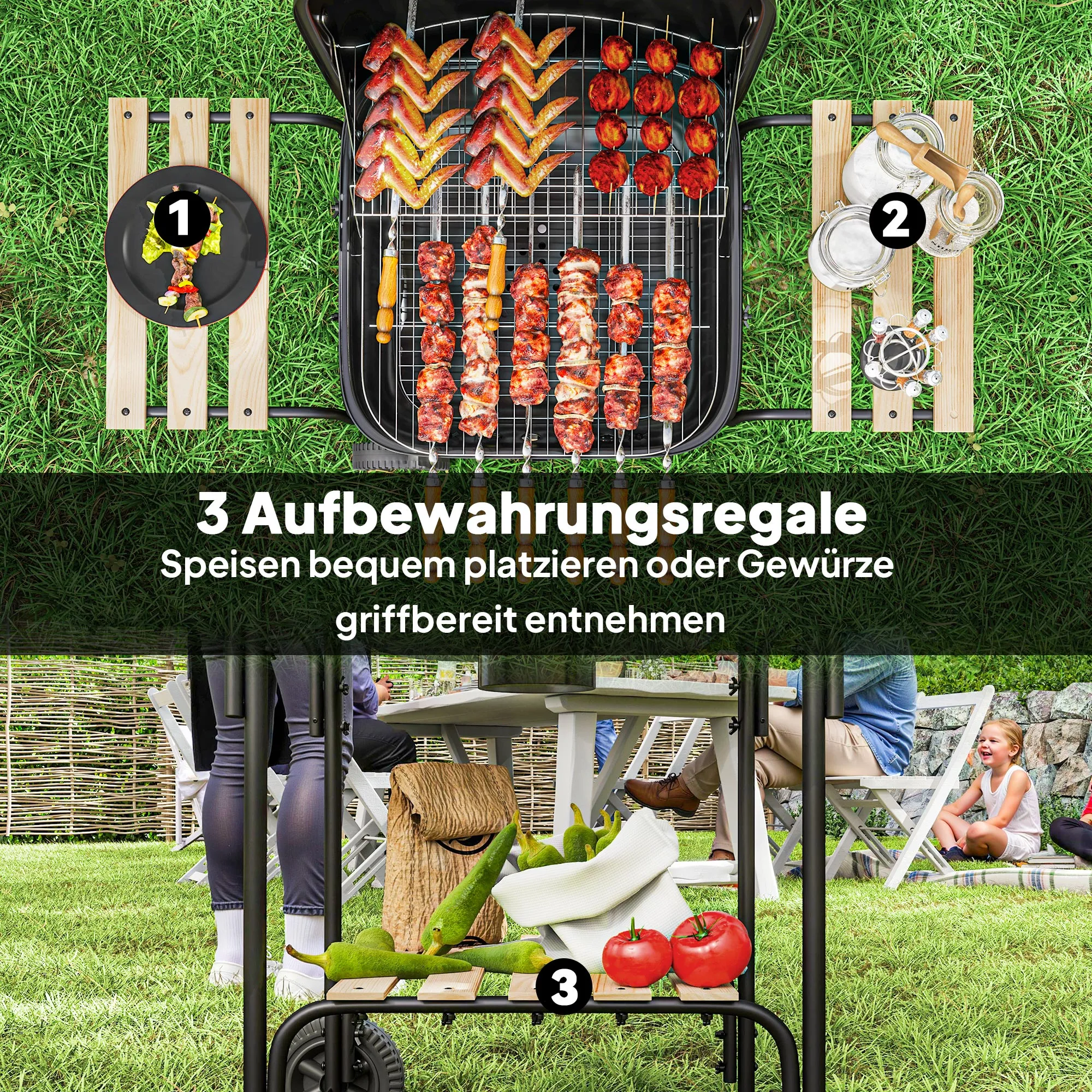 Stalen Houtskoolgrill Met Afsluitbare Deksel, Grillrooster, Wielen, Handvat, Houten Plank 98 X 54 X 91 Cm Zwart