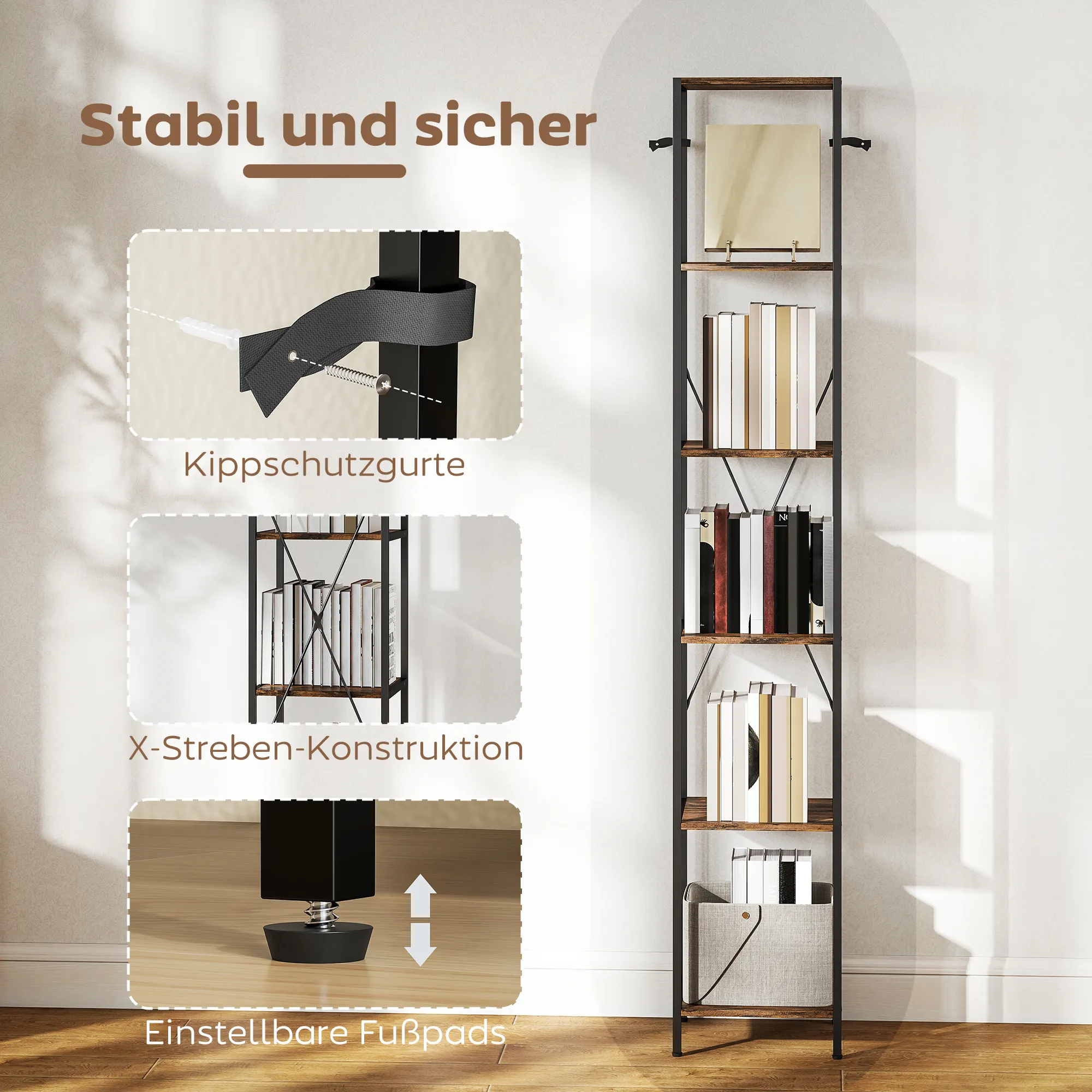 Op zoek naar een stabiele en stijlvolle boekenkast voor al je waardevolle boeken, decoraties en verzamelobjecten? De slanke [BRAND NAME] 6-laags boekenkast met robuust koolstofstalen frame biedt een stevige basis en optimale opbergruimte. Het chique industrieel ontwerp voegt karakter en elegantie toe aan elke kamer, terwijl de anti-kantelbanden en verstelbare voeten zorgen voor extra stabiliteit en bescherming.