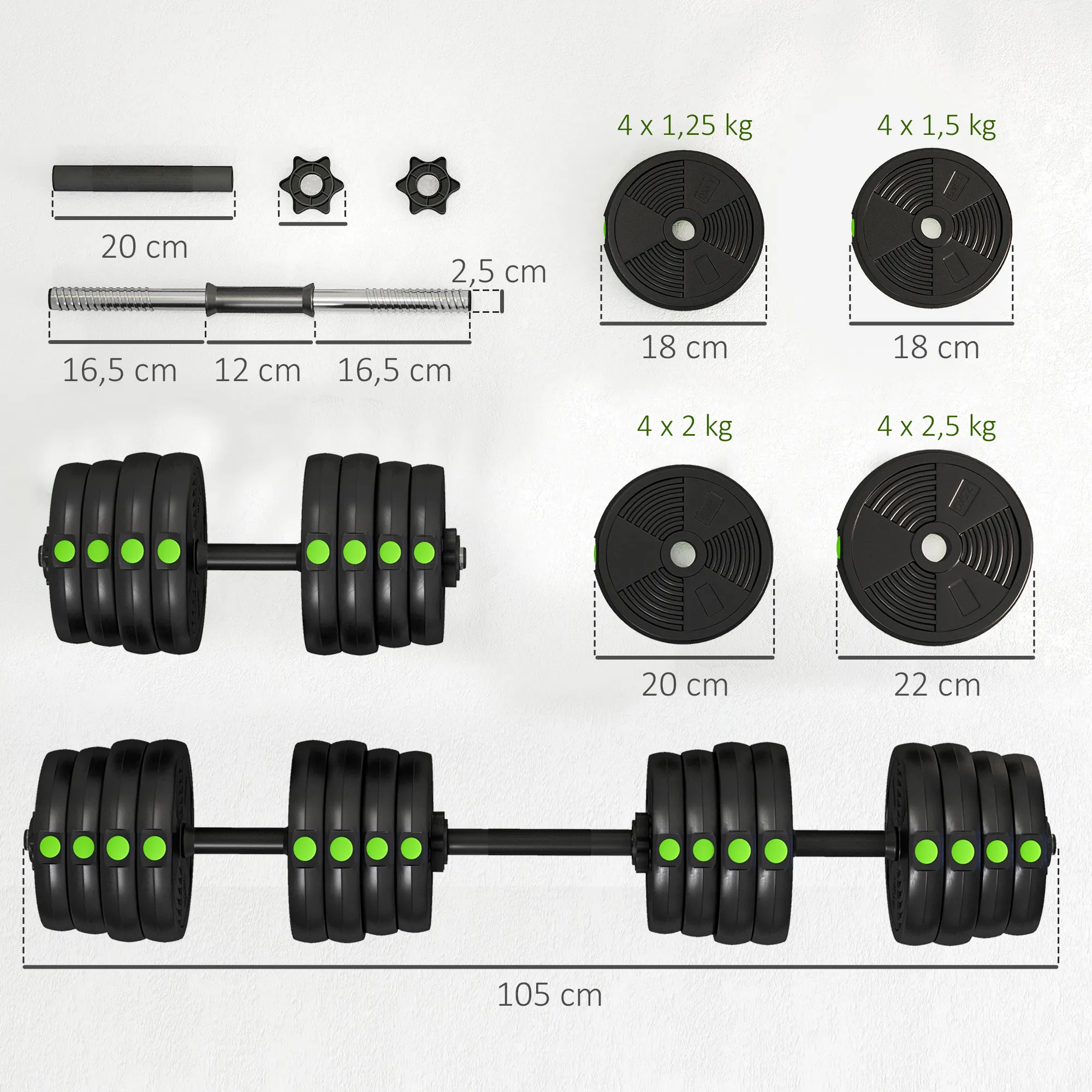 - Gewichtsschijf grootte: (2,5kg) Ø22 x 3,8T cm, (2kg) Ø20 x 3,5T cm, (1,5kg) Ø18 x 3,2T cm, (1,25kg) Ø18 x 3T cm