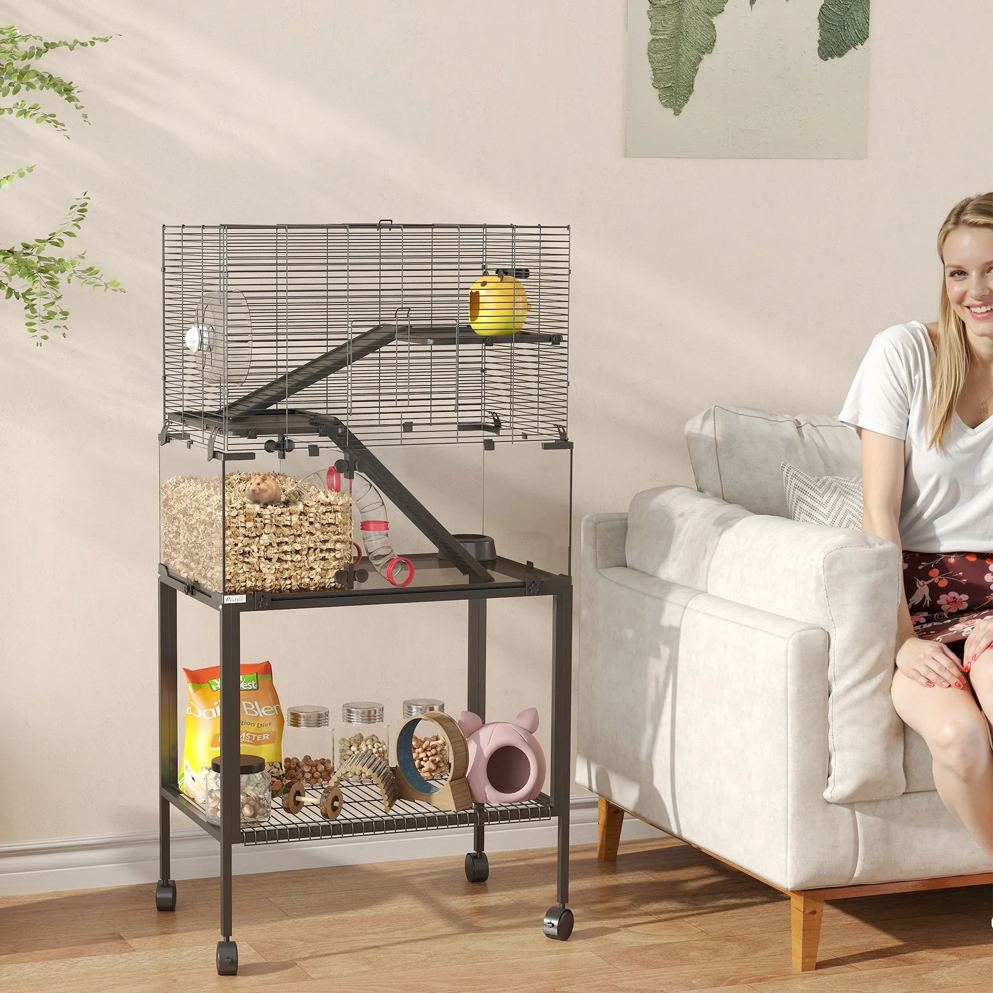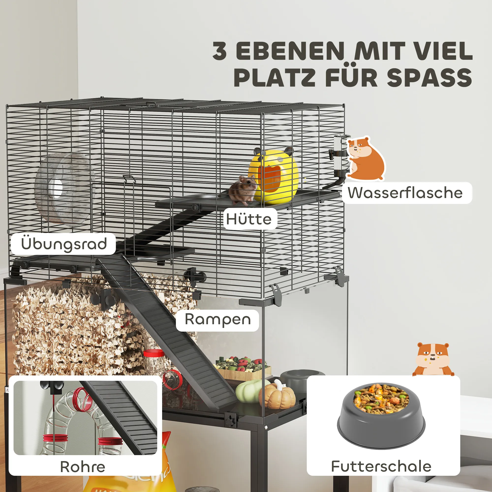 Upgrade het verblijf van je kleine knaagdier met de [BRAND NAME] hamsterkooi! Deze kooi heeft twee hellingen en platforms om te klimmen, ontdekken en spelen. De diepe glazen basis stimuleert natuurlijk graafgedrag, terwijl het loopwiel, de gezellige schuilplaats, voerbak, waterfles en verbindingsbuizen zorgen voor activiteit en vermaak. Met gemakkelijk toegankelijke deuren voor eenvoudig schoonmaken en voeren, en een stalen frame met vergrendelbare wielen voor een veilig en verplaatsbaar huis.
