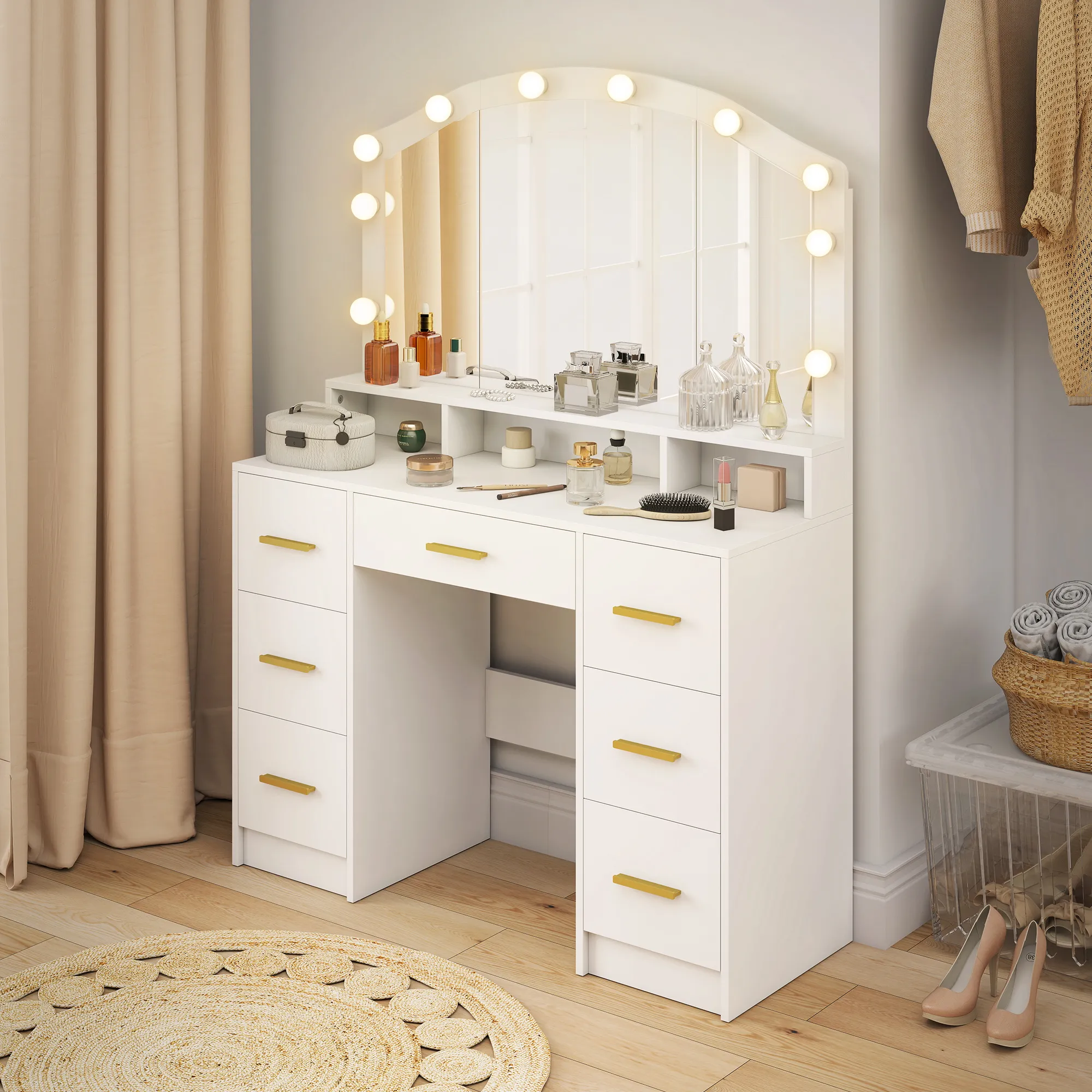 Ervaar dagelijks meer helderheid met de [BRAND NAME] make-uptafel. Tien Hollywood-lampen omringen de spiegel en bieden aanpasbare verlichting – koel, natuurlijk of warm – voor elke stemming. Drie vakken en een lang plank op het ruime werkblad, samen met zeven laden, zorgen voor perfecte organisatie van make-up- en huidverzorgingsproducten. In stralend wit met gouden handgrepen, brengt deze make-uptafel zachte elegantie en charme in elke hoek van de kamer.