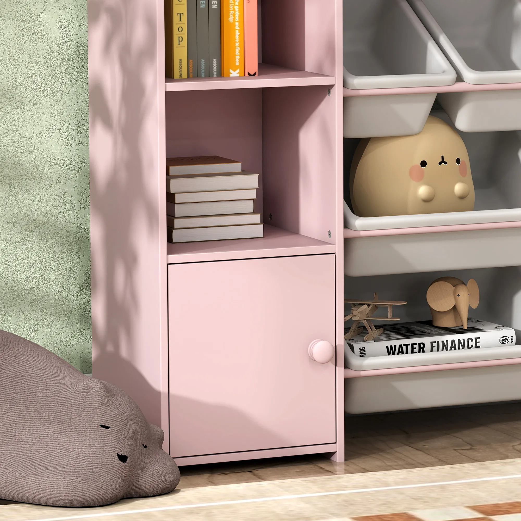 • Veelzijdige opbergmogelijkheden: boekenrek, speelgoedbakken en kast in één