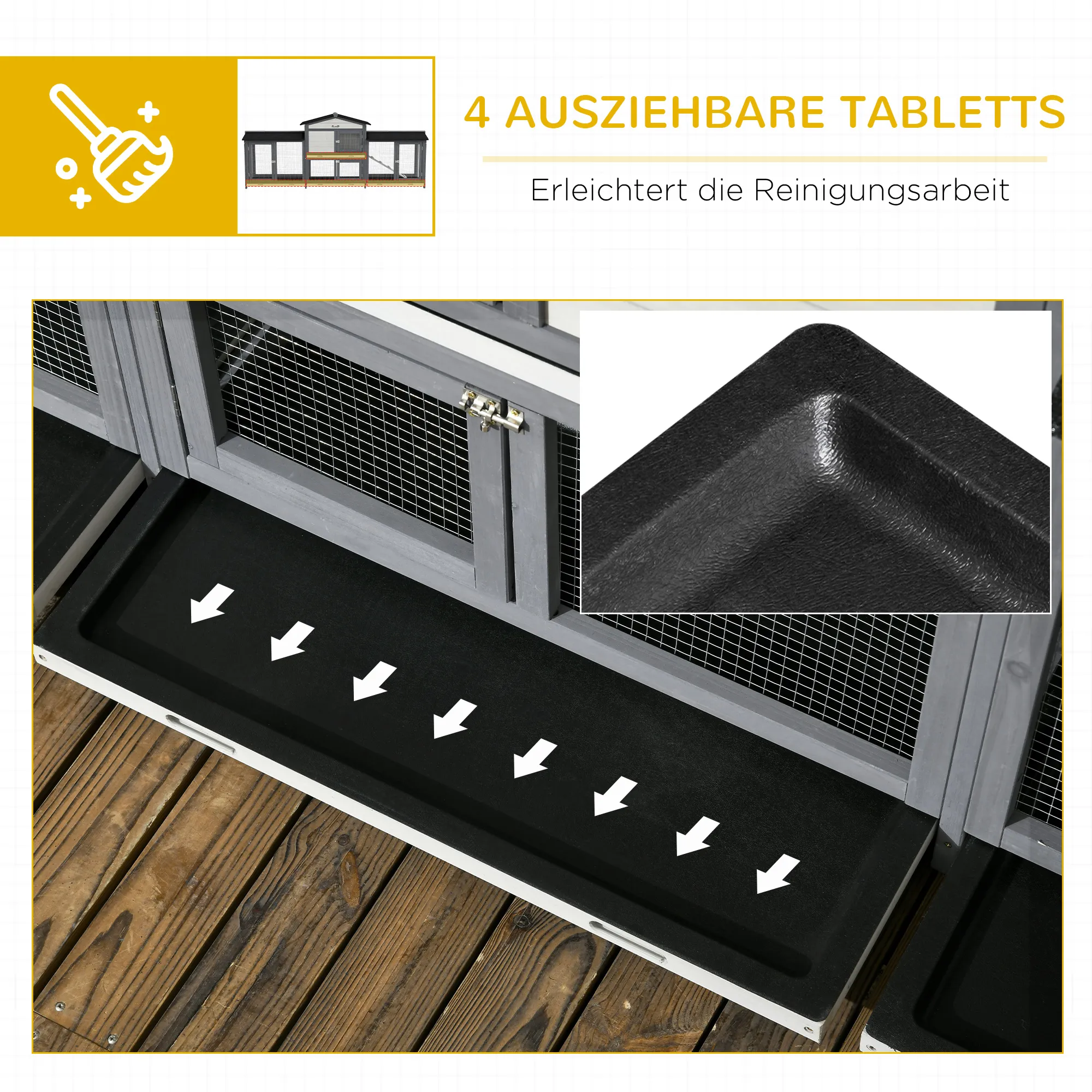 • Deurafmetingen: 30L x 26H cm (woonhuis), 30L x 25H cm (uitloopbox onder het woonhuis), 29L x 47,5H cm (zij-uitloopboxen)