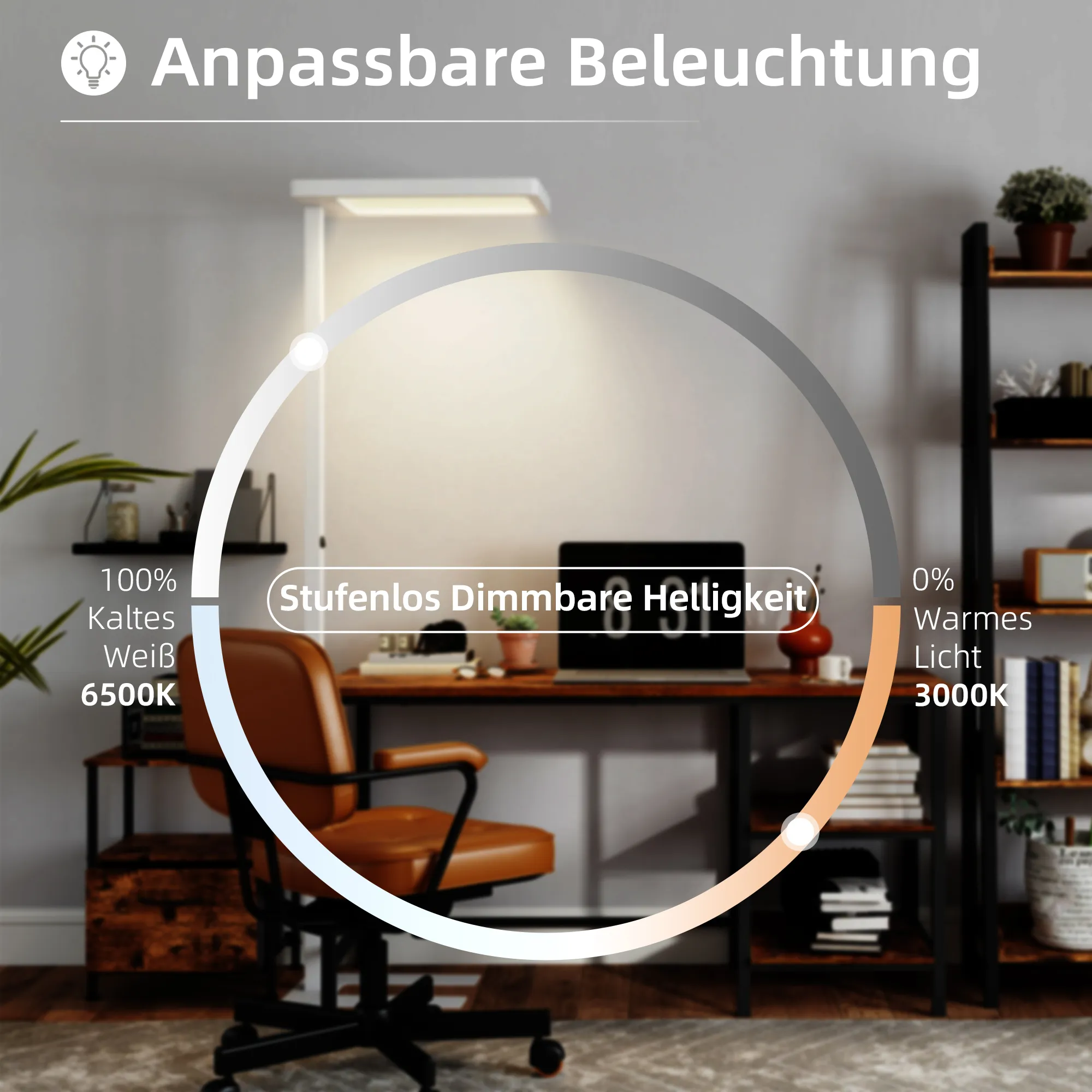 Heb je last van fel, ongelijkmatig licht dat ‘s nachts tijdens het werken of lezen vermoeide ogen veroorzaakt? De [BRAND NAME] staande lamp biedt een breed, schaduwvrij en zacht licht dat de hele werkruimte verlicht. De dimbare staande lamp staat hoog met een brede lampenkap, ideaal voor studie, creatief werk of gezellige avonden. Met de afstandsbediening schakel je eenvoudig van koel, helder licht naar warm, uitnodigend licht van de LED staande lamp.