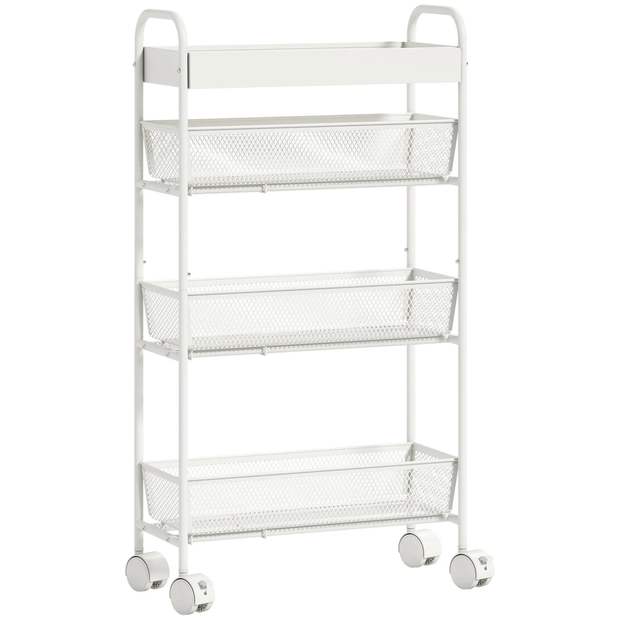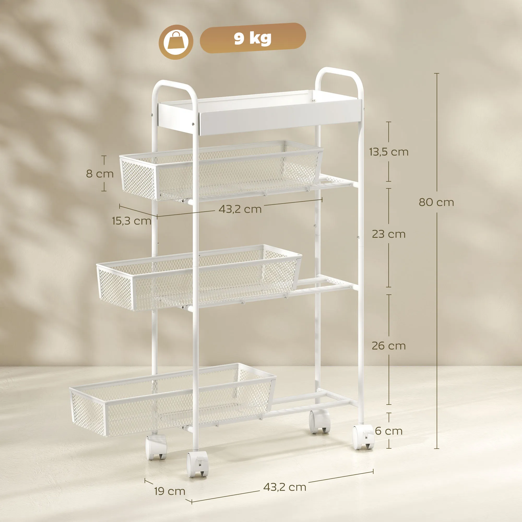 TRUUSK Metalen Keukenwagen – 3 Manden – Slank Ontwerp – 4 Wielen – Voor Keuken, Woonkamer, Badkamer – Wit