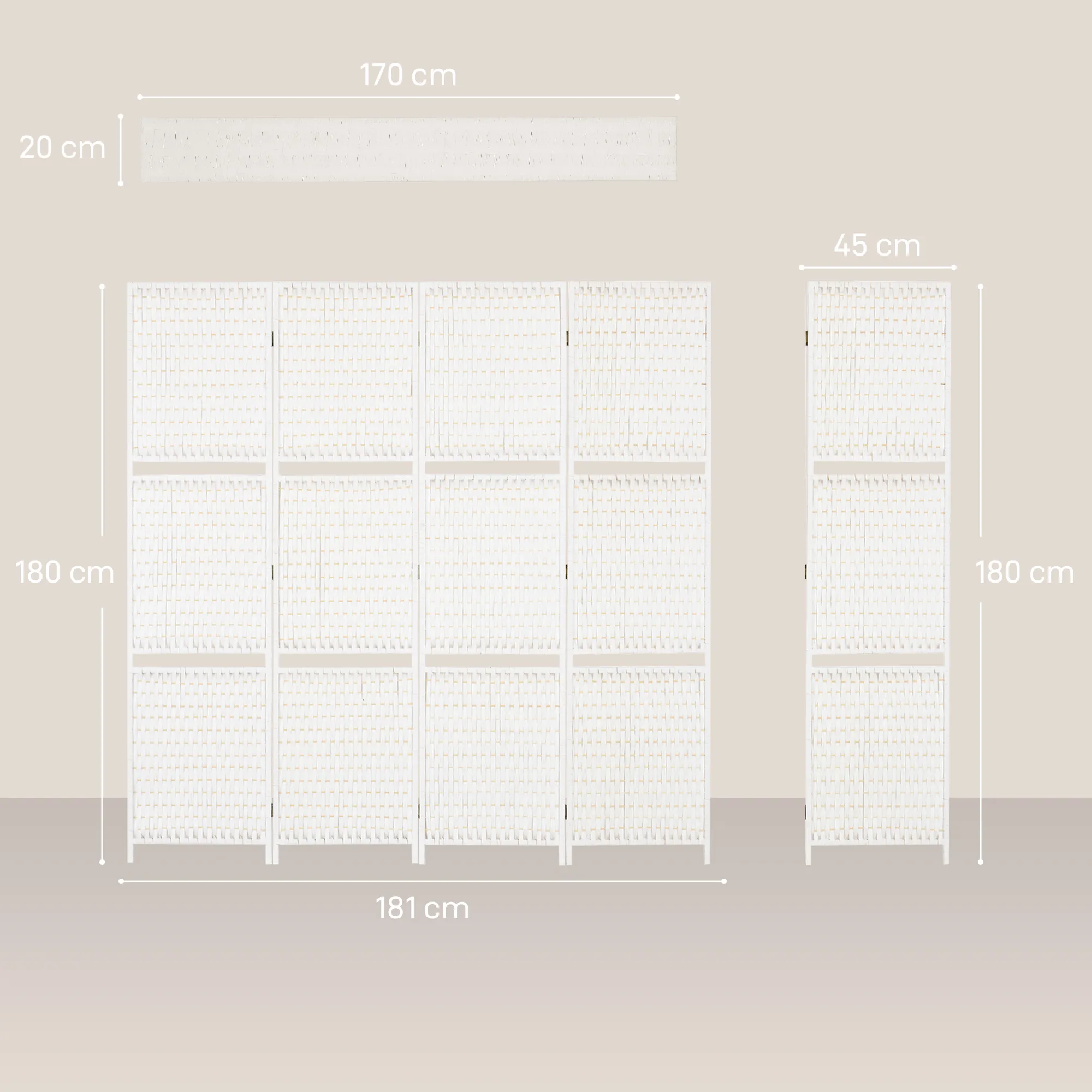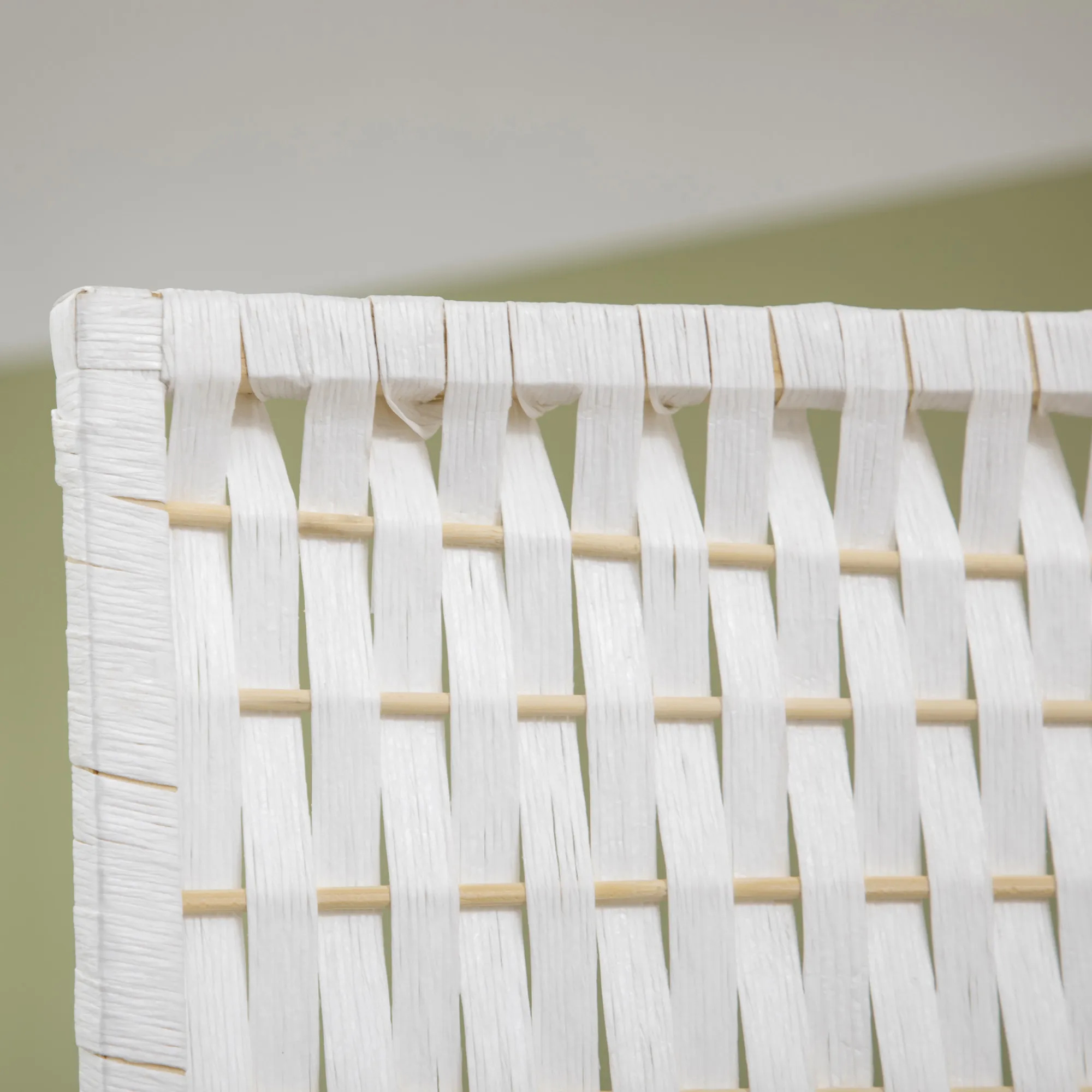 Voeg wat charmante flair toe aan je huis met deze prachtige 4-delige kamerverdeler van grenenhout, bamboe en gevlochten papiervezels in een stro-witte afwerking. Het unieke gevlochten ontwerp geeft elke kamer een harmonieuze uitstraling en verrijkt de sfeer.