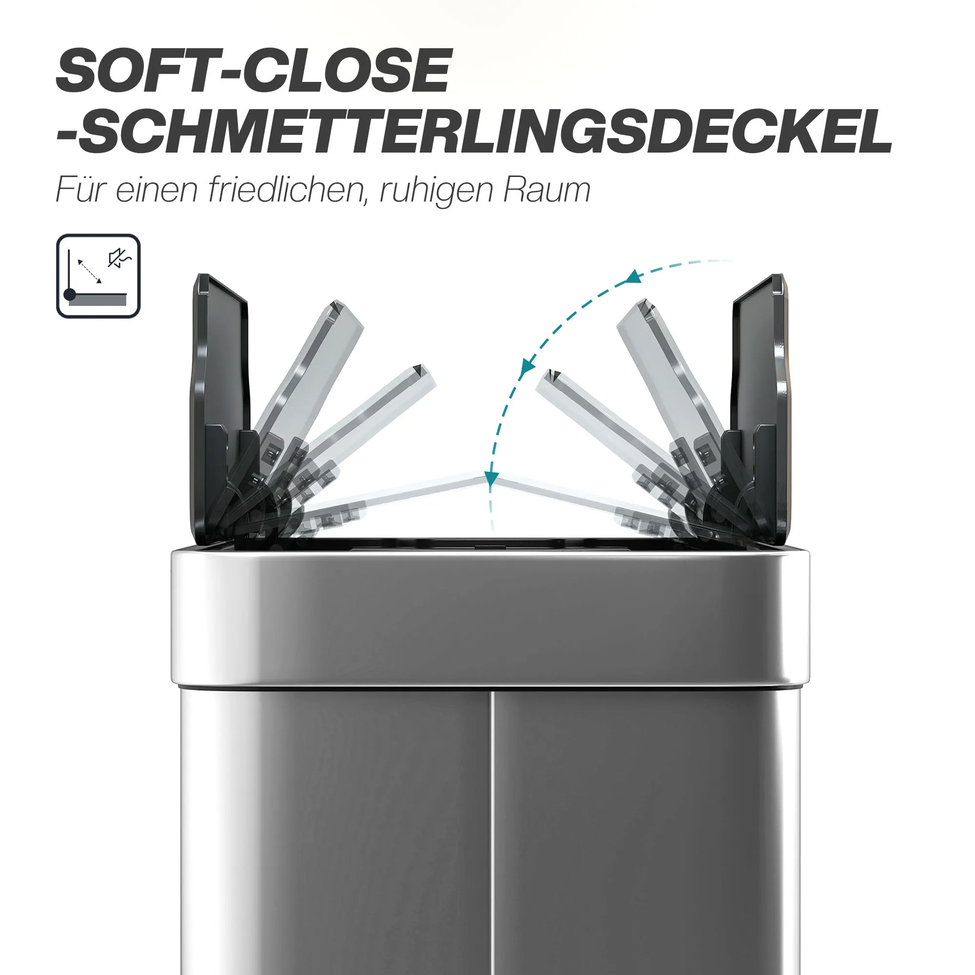 • Geruisloze werking: vlinderdeksel opent vanuit het midden en sluit stil