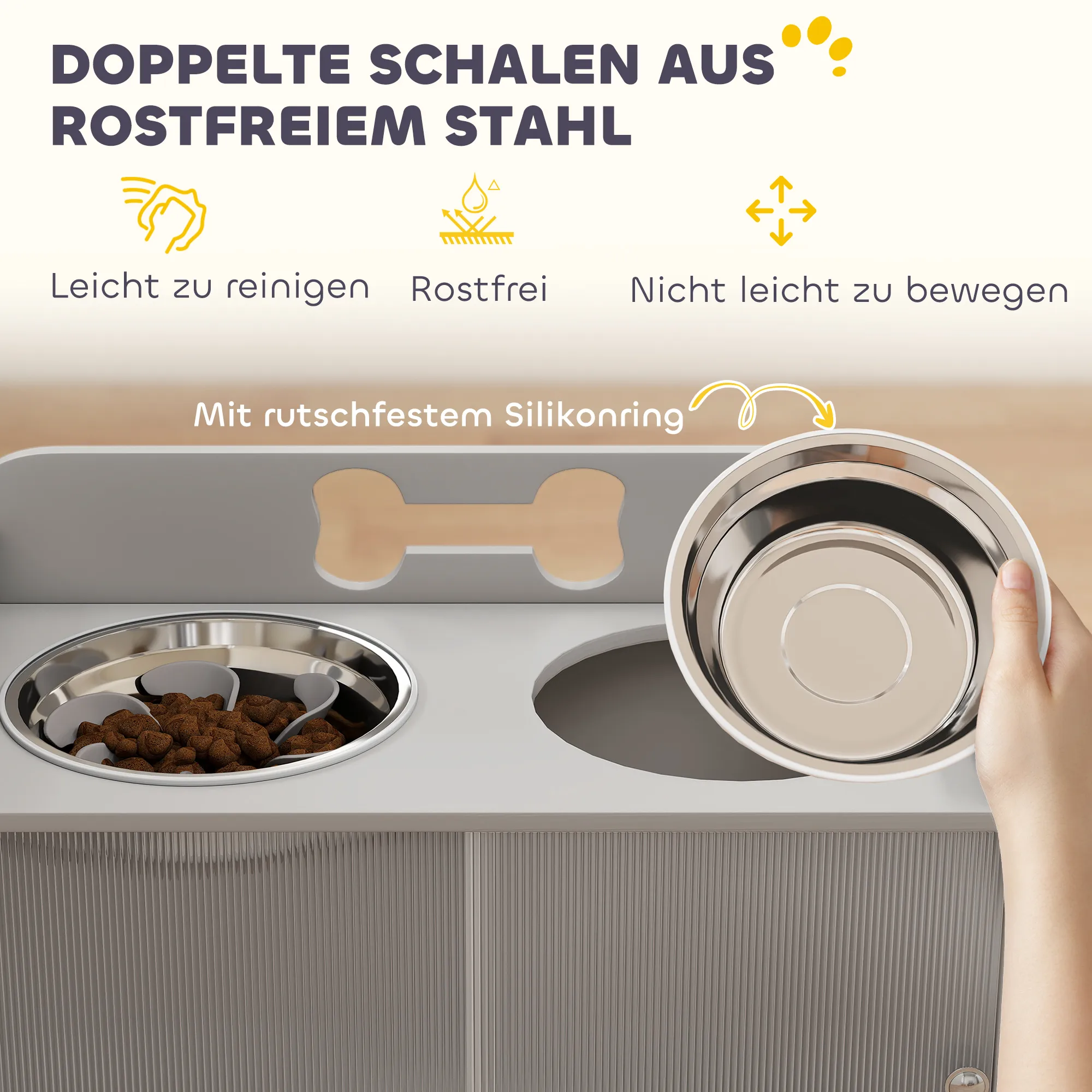 - Stevig en stabiel: MDF-constructie met antislipstrips voorkomt verschuiving van de kommen