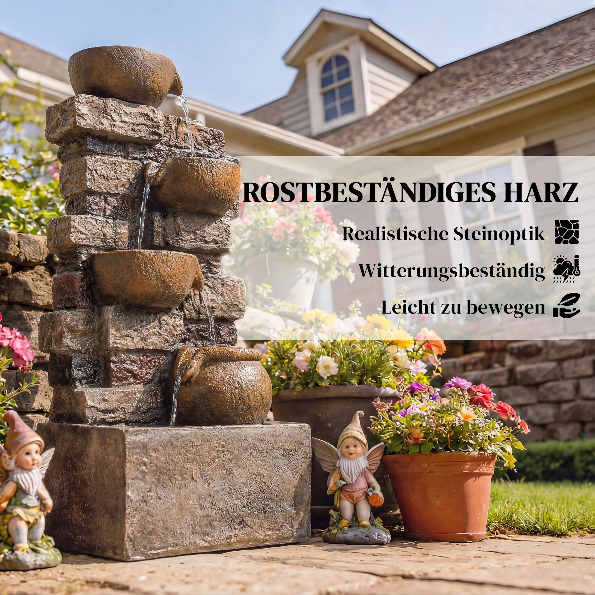 Wil je je tuin omtoveren tot een rustige oase? De [BRAND NAME] tuinfontein brengt leven in je terras met zacht kabbelend water over vijf niveaus, vergezeld van warme LED-lampjes die ’s avonds voor een vredige sfeer zorgen. Laat je meevoeren door het rustgevende geluid en de ontspannen sfeer na een lange dag.