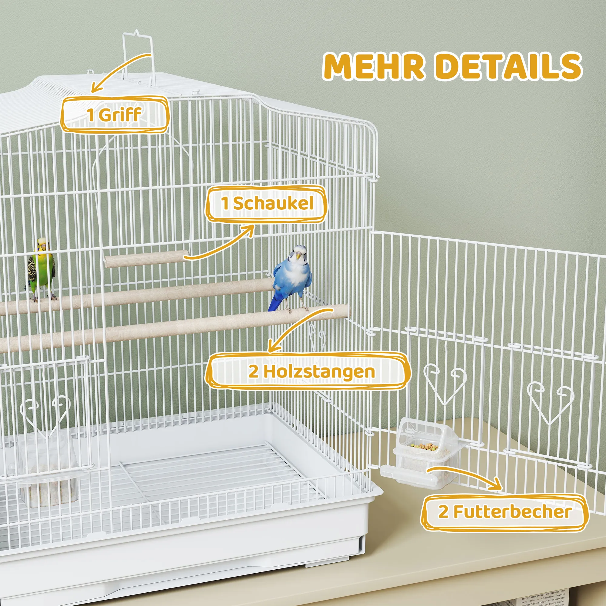 Deze kleine vogelkooi van [BRAND NAME] biedt jouw gevleugelde vrienden veel ruimte om te springen en te zingen. Dankzij de uitneembare bodemlade is hij gemakkelijk schoon te maken. De kooi wordt geleverd met twee voerbakken en twee zitstokken. De transportgreep maakt het eenvoudig om de kooi op te hangen. Deze vogelkooi in vintage design is het perfecte huis voor jouw kleine vogels.