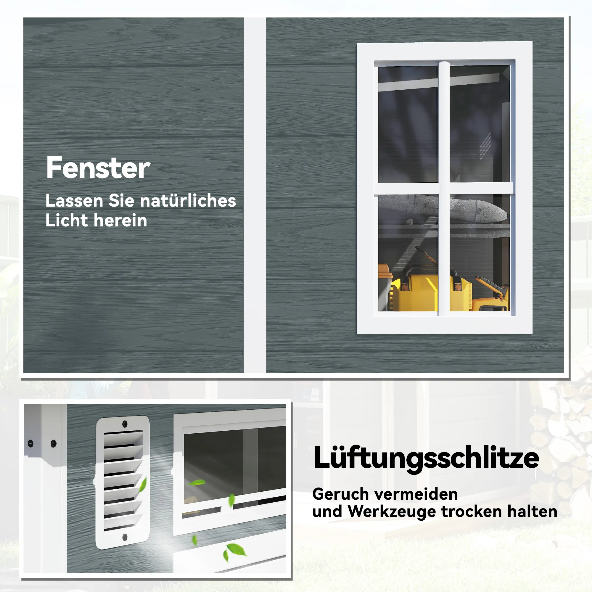 Houd je tuin netjes en georganiseerd met het [BRAND NAME] kunststof tuinhuis. Dit tuinhuis is ideaal voor het opbergen van gereedschap, fietsen en barbecue-accessoires. De grote ramen zorgen voor natuurlijk licht en de ventilatieopeningen zorgen voor een constante luchtcirculatie, waardoor vocht en geuren worden verminderd. Dankzij de brede dubbele deuren heb je gemakkelijke toegang tot je spullen, en met het slot zijn je bezittingen veilig opgeborgen. Dit weerbestendige tuinhuis is een praktische toevoeging aan elke buitenruimte!