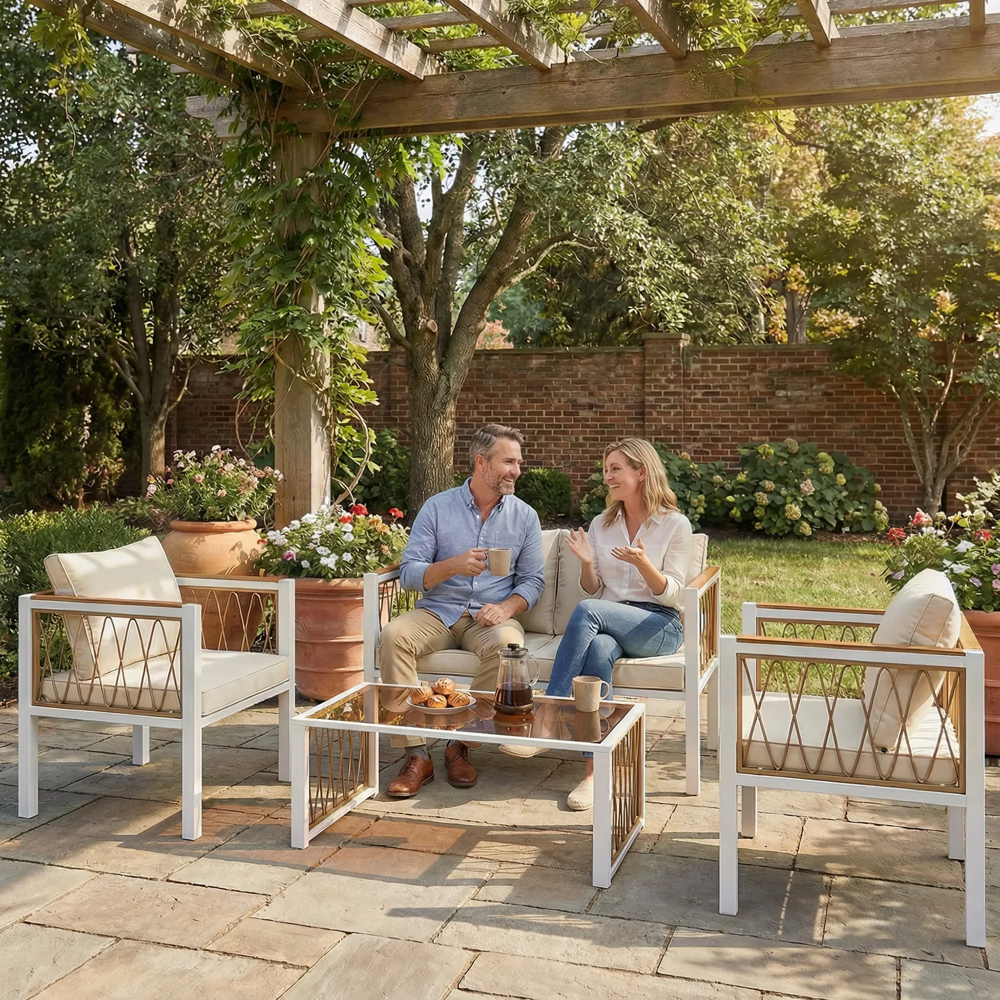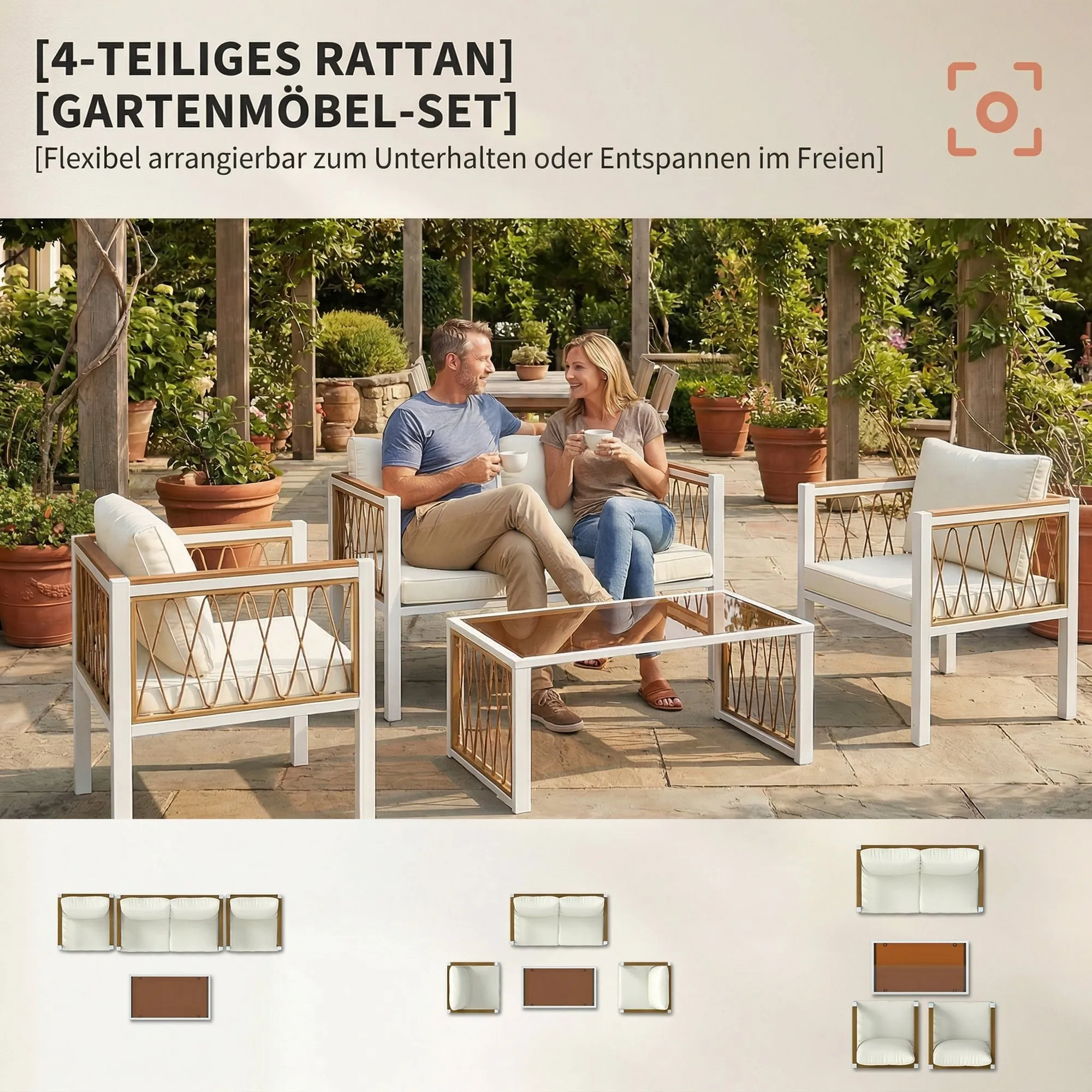 - Materiaal: Metaal, PE-Rattan, WPC, Polyester, Gehard glas, Schuim, Katoen