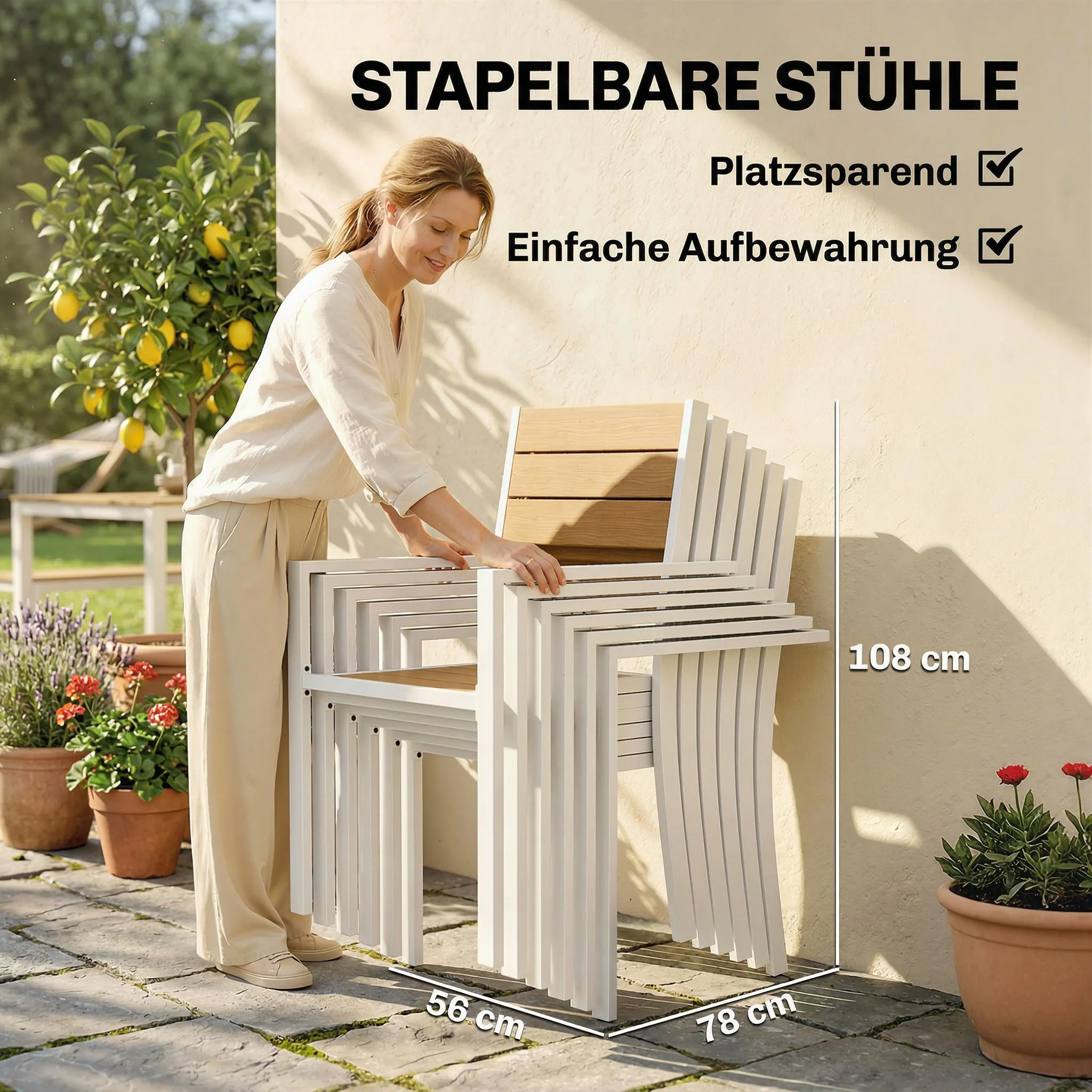 - Praktisch design: Stapelbare stoelen en ruime tafel voor gemakkelijke opslag en comfortabel zitten