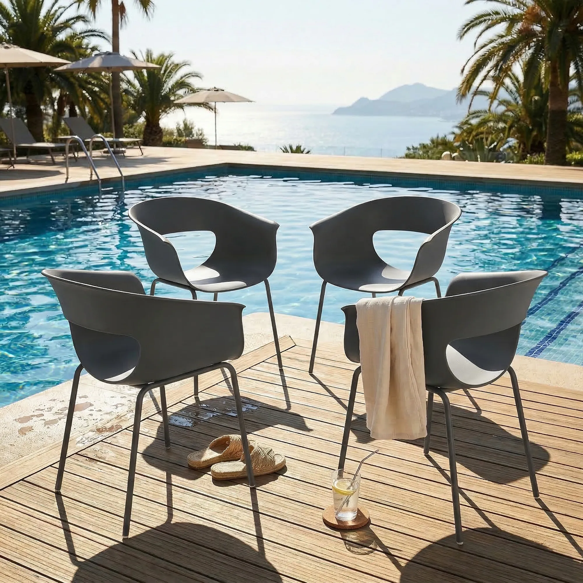 Upgrade jouw buitenruimte met moderne tuinstoelen van [BRAND NAME]! Deze ergonomisch ontworpen stoelen bieden gladde armleuningen, een gebogen rugleuning en een stijlvol uitsnijontwerp voor luchtcirculatie. Gemaakt van robuust plastic en roestvrijstalen poten, zijn deze terrasstoelen stabiel, gemakkelijk schoon te maken en ideaal voor familiebijeenkomsten, buitencafés of ontspannen loungen.