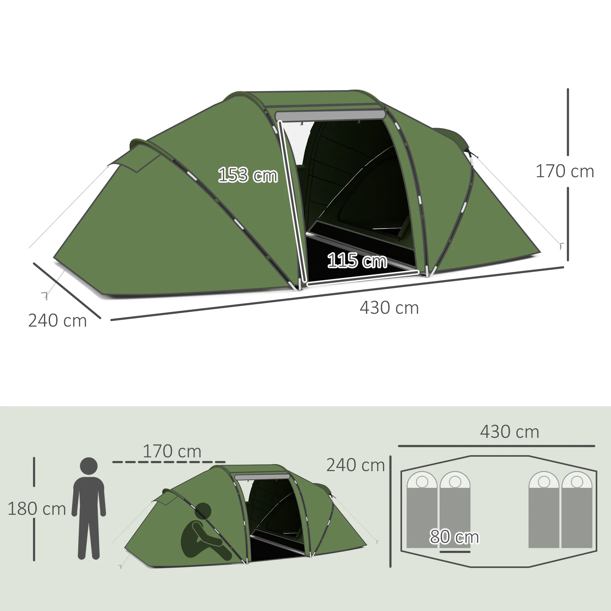 Tunneltent Voor 4-6 Personen, Kampeertent Met Deur, Grondzeil, 2000mm Waterdicht Groen