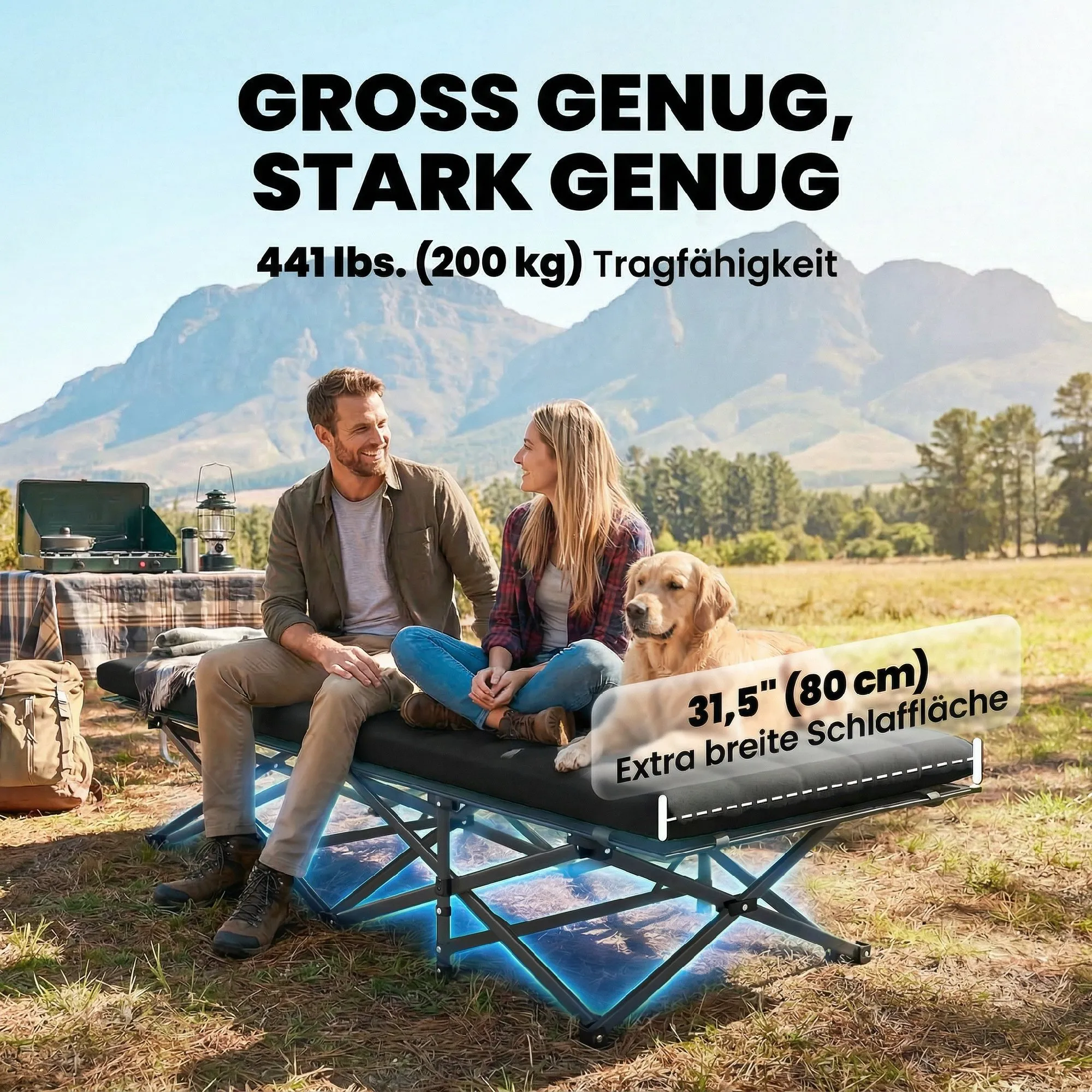 Transformeer je buiten slaapervaring met het [BRAND NAME] campingbed! De afneembare, 3 cm dikke kussenlaag zorgt voor warmte op koele nachten, terwijl de ademende Oxford-stof je koel houdt in de zomer. Het extra grote frame biedt voldoende ruimte voor grotere kampeerders en de robuuste constructie kan tot 200 kg dragen. Een veelzijdige metgezel voor elk avontuur!