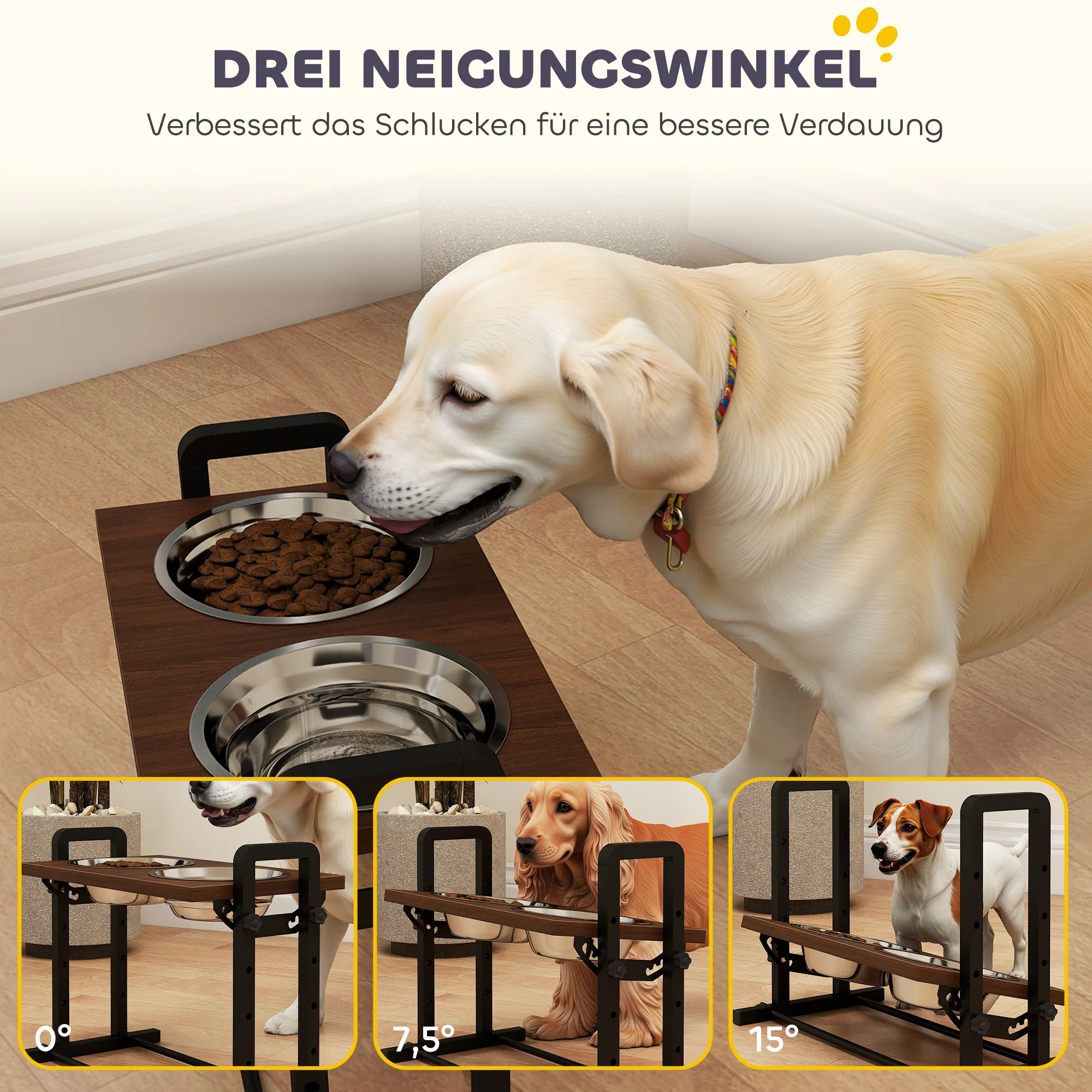 - Individueel comfort: drie hellingshoeken en vier hoogtes zorgen voor een comfortabele eetervaring en een betere spijsvertering