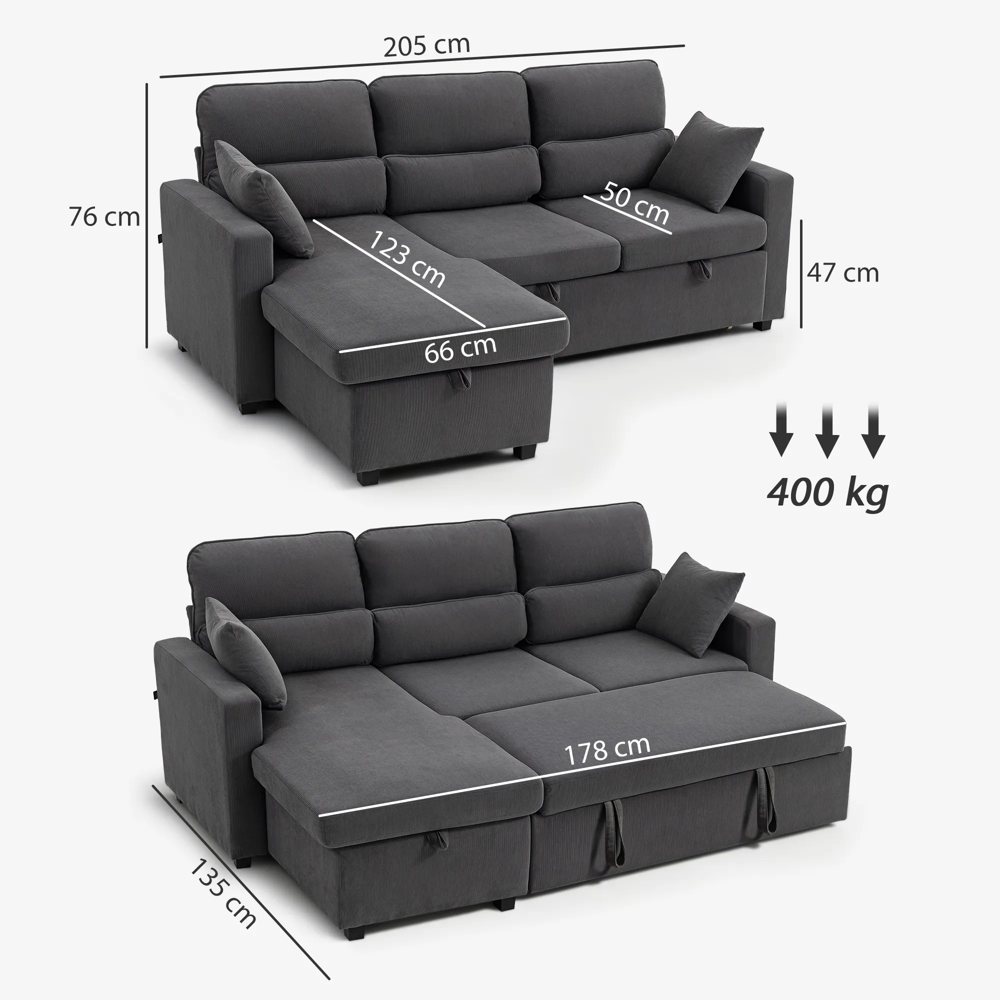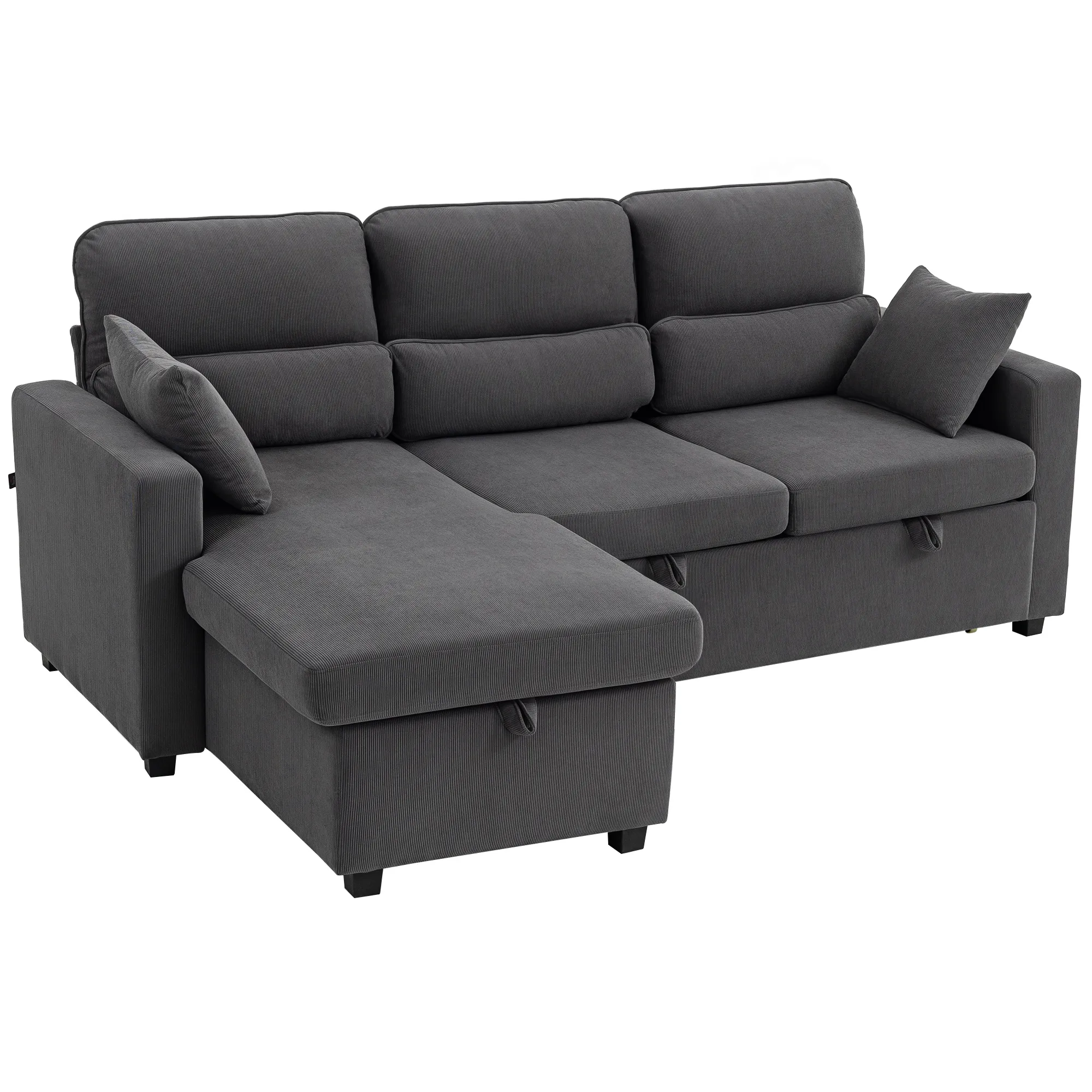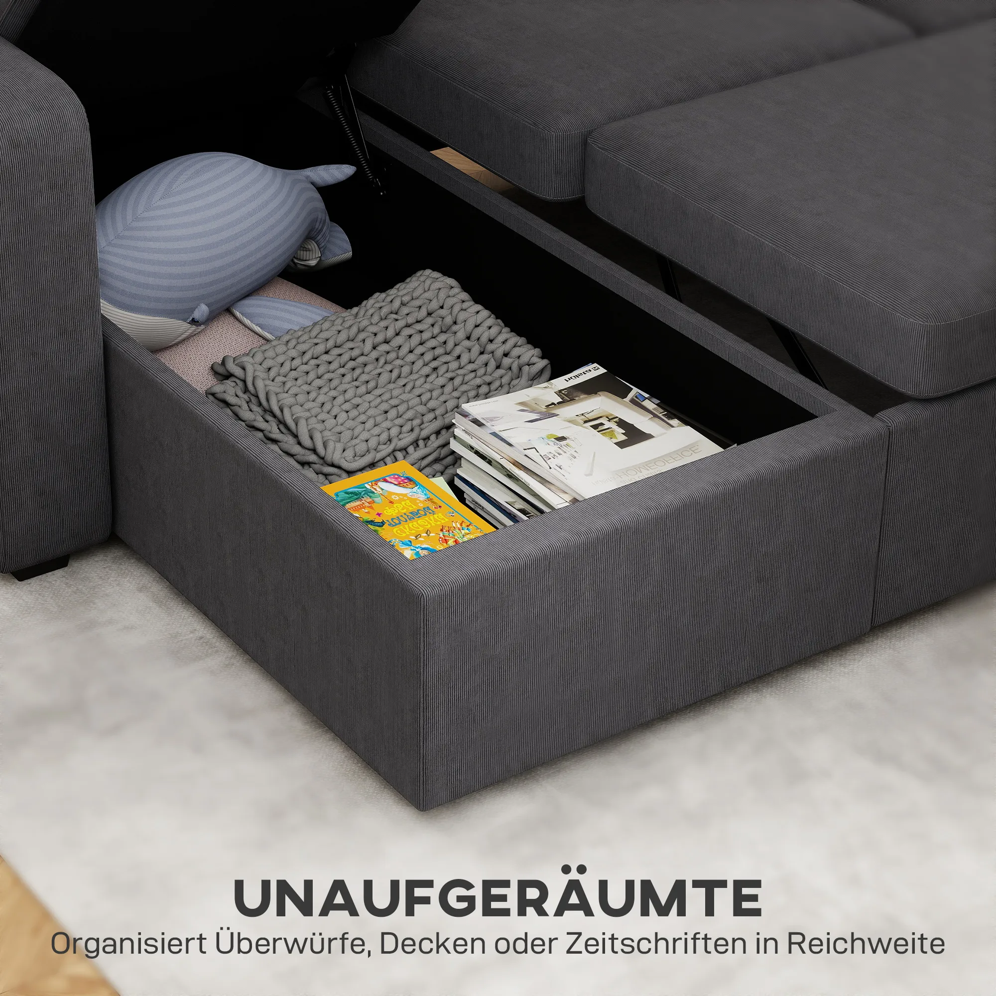 Verstelbare Bedbank, L-vormige Logeerbank Met Bedfunctie, Opslagruimte, Kussens, Voor Woonkamer, Gastenkamer, Donkergrijs
