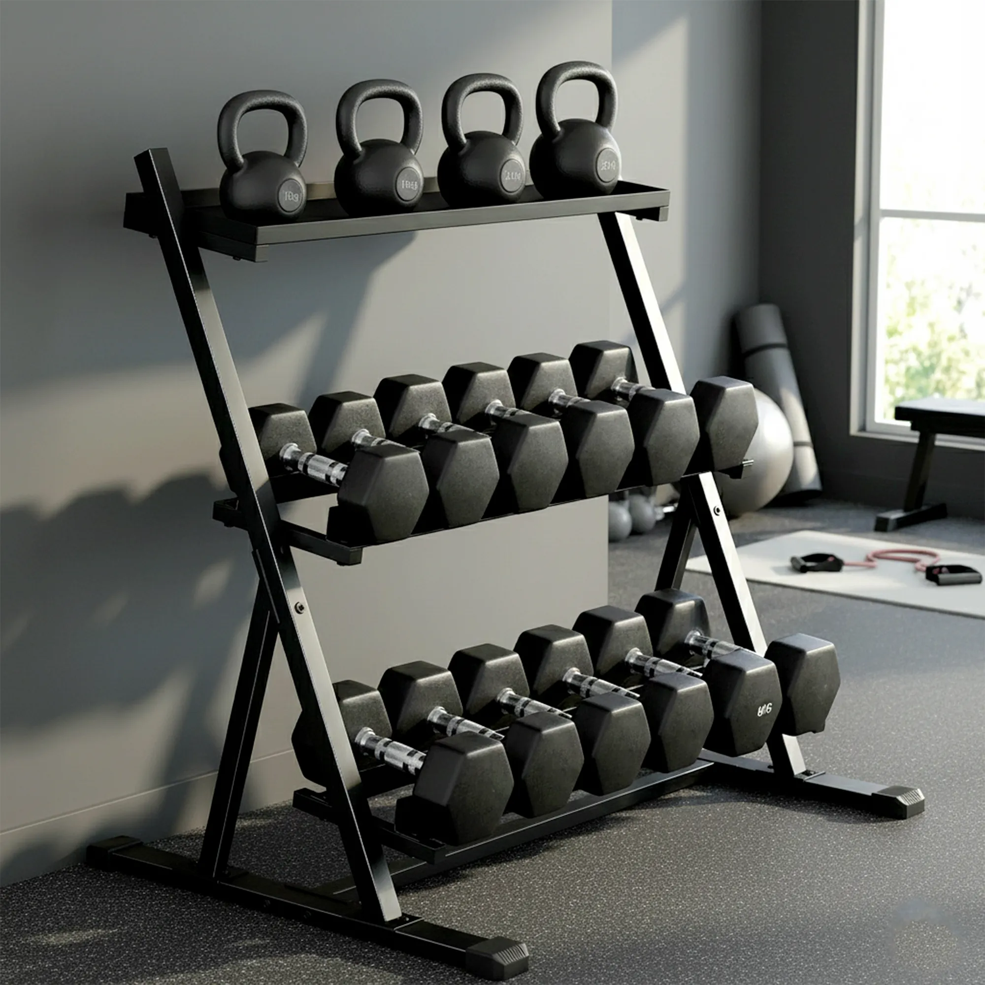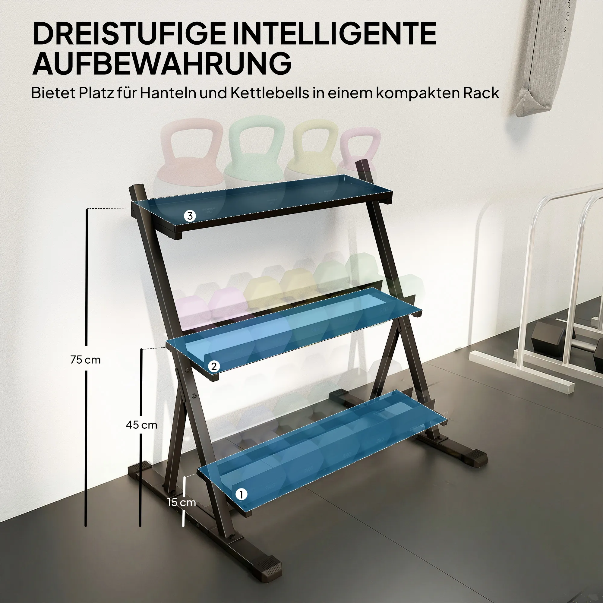 • Ruimtebesparend: compact ontwerp met 3 niveaus voor snelle toegang tot gewichten