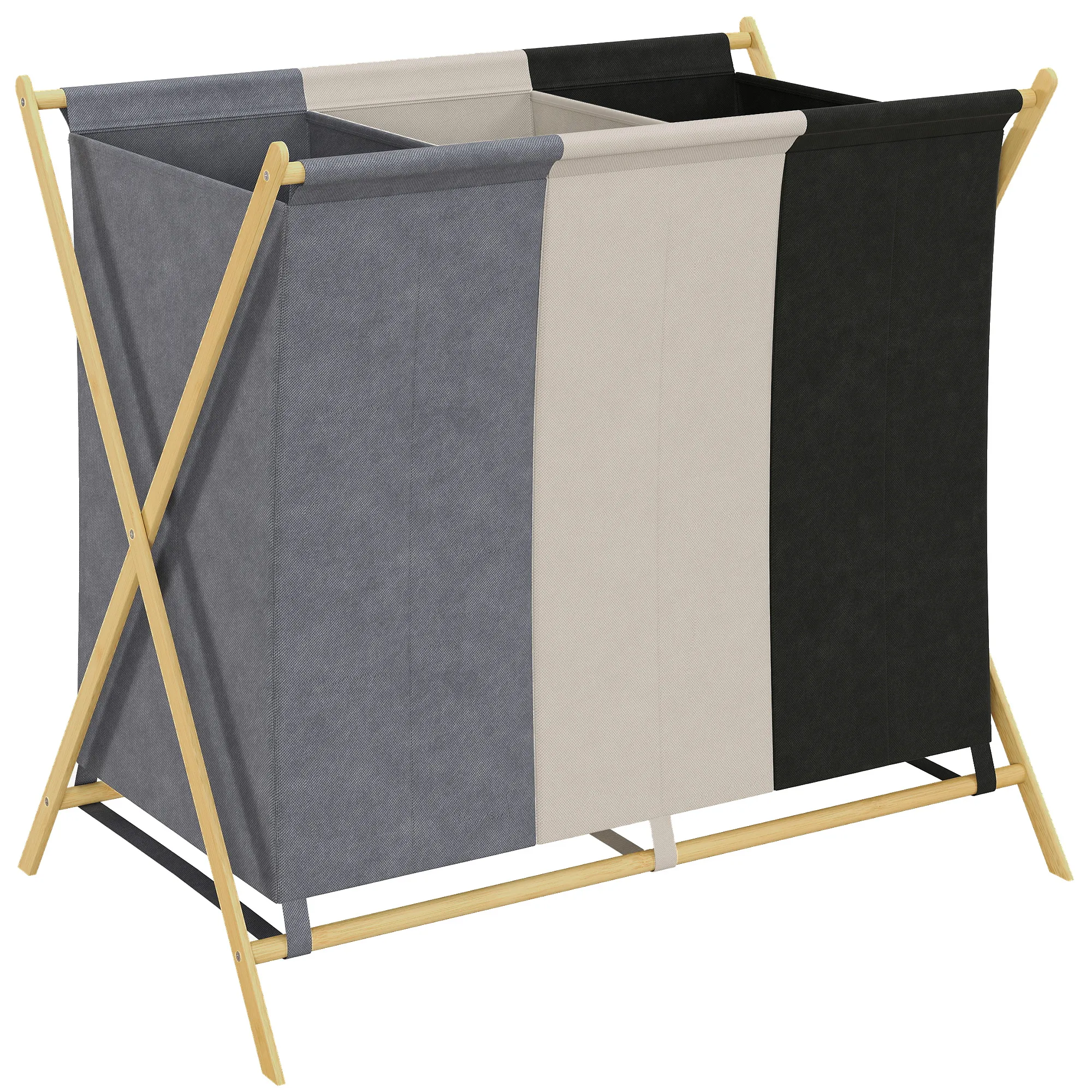 Maak je wasorganisatie efficiënter en houd je huis netjes met de [BRAND NAME] wasmand. Deze stijlvolle wasmand is gemaakt van stof en heeft een capaciteit van 129 liter, verdeeld over drie aparte compartimenten om vuile kleding te sorteren. Het X-vormige frame van natuurlijk bamboe maakt de wasmand gemakkelijk opvouwbaar en draagbaar, waardoor het sorteren van je was en het snel opbergen van de mand wanneer deze niet in gebruik is, een fluitje van een cent wordt.