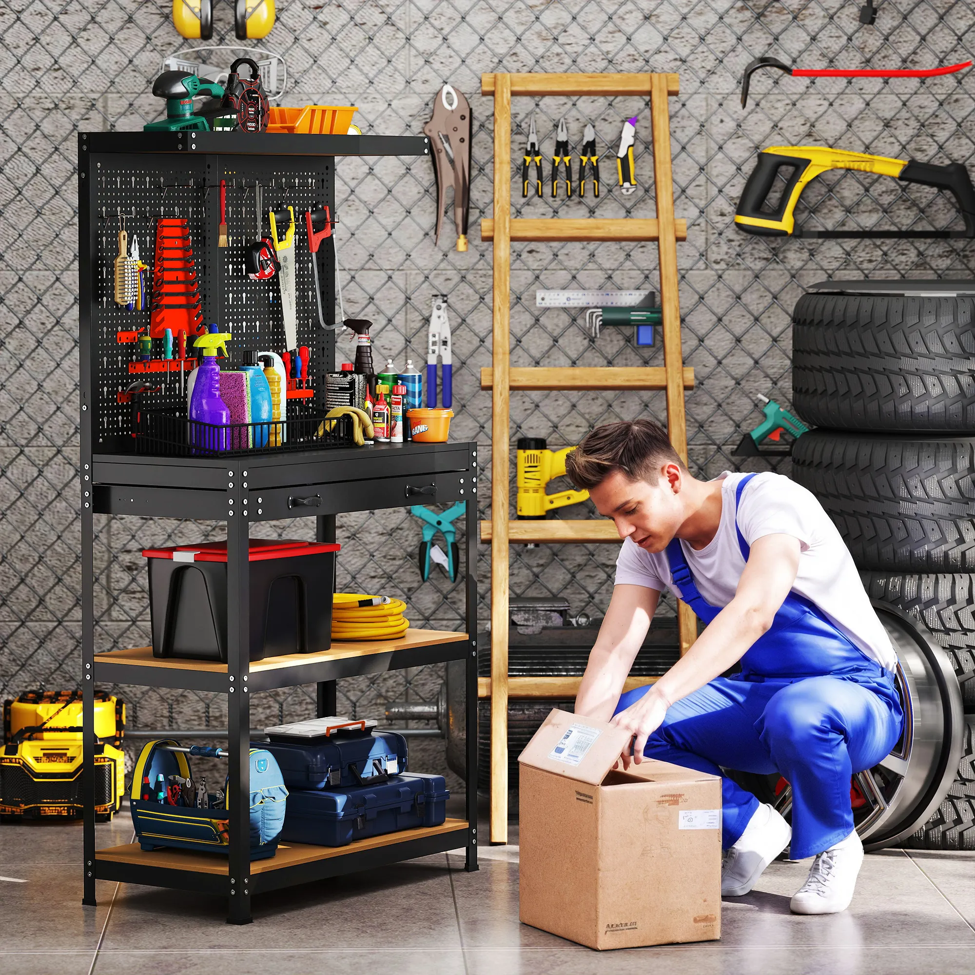 - Georganiseerde opslag: grote werktafel met haken en meerdere planken voor al je gereedschap