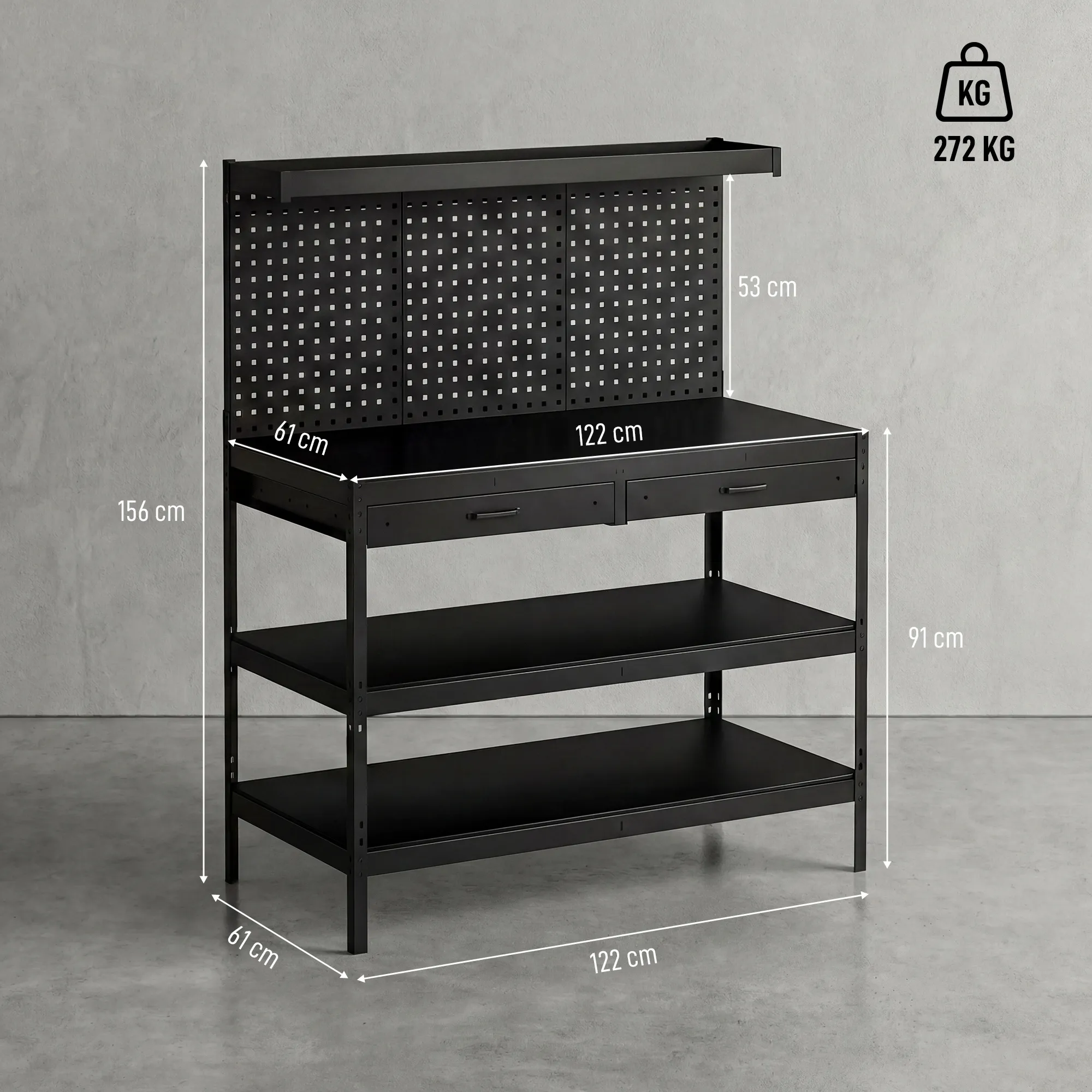 De Werkbank van [BRAND NAME] transformeert een rommelige garage in een creatief paradijs. Geen eindeloze zoektochten naar gereedschap en een stevig werkoppervlak meer, en onafgemaakte projecten zorgen niet langer voor frustratie. Deze werkbank integreert een stalen gatenwand en planken om alles op één plek te organiseren. Het robuuste stalen frame draagt tot 272 kg en biedt de veiligheid en ruimte die je nodig hebt om je ideeën met vertrouwen en gemak tot leven te brengen.