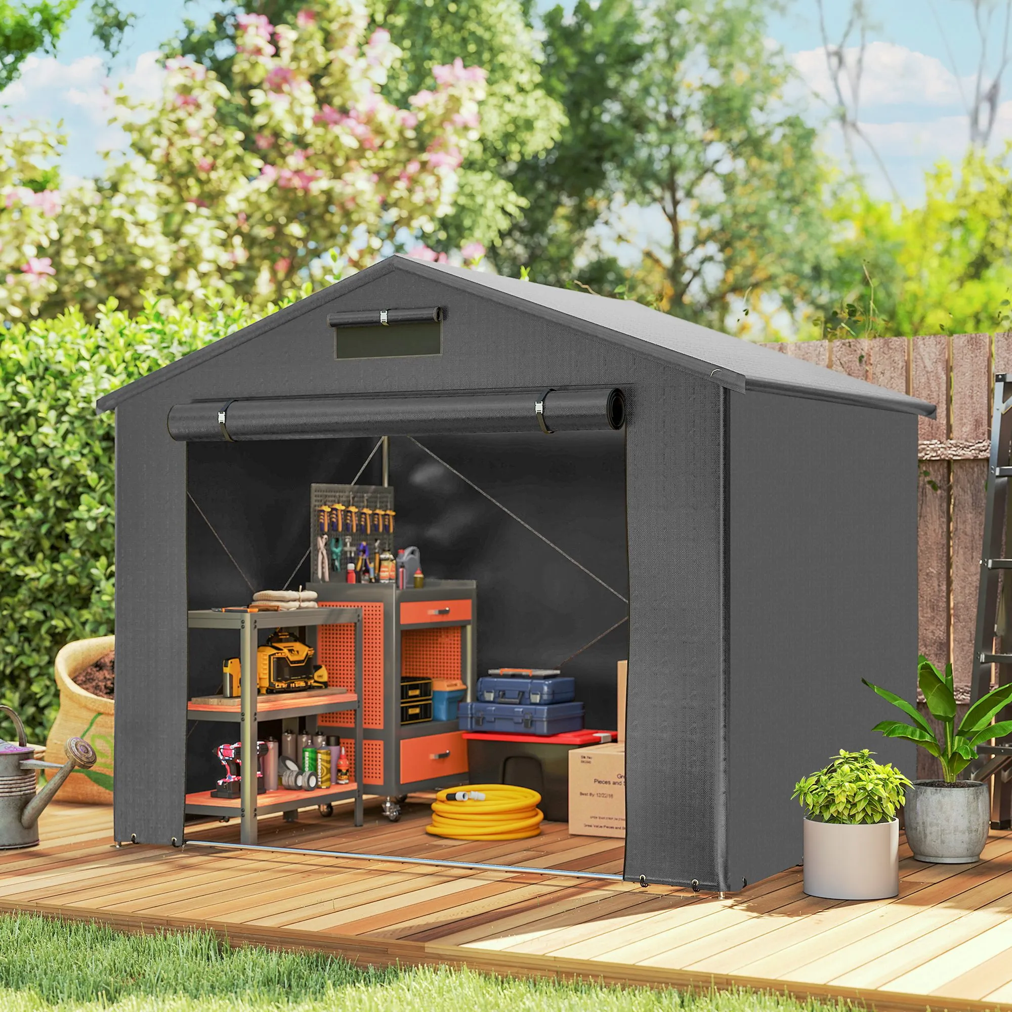 Ben je het zat dat je fietsen en gereedschap worden blootgesteld aan regen en stormachtige wind, waardoor ze roesten en beschadigd raken? De [BRAND NAME] garagetent biedt je een veilige schuilplaats voor je waardevolle spullen. Dankzij het robuuste, weerbestendige PE-zeil en het versterkte stalen frame van de tentgarage, creëer je een ruime en overzichtelijke toevluchtsoord. Geniet eindelijk van rust en veiligheid in een opgeruimde en beschermde buitenruimte en verander chaos in ontspanning.