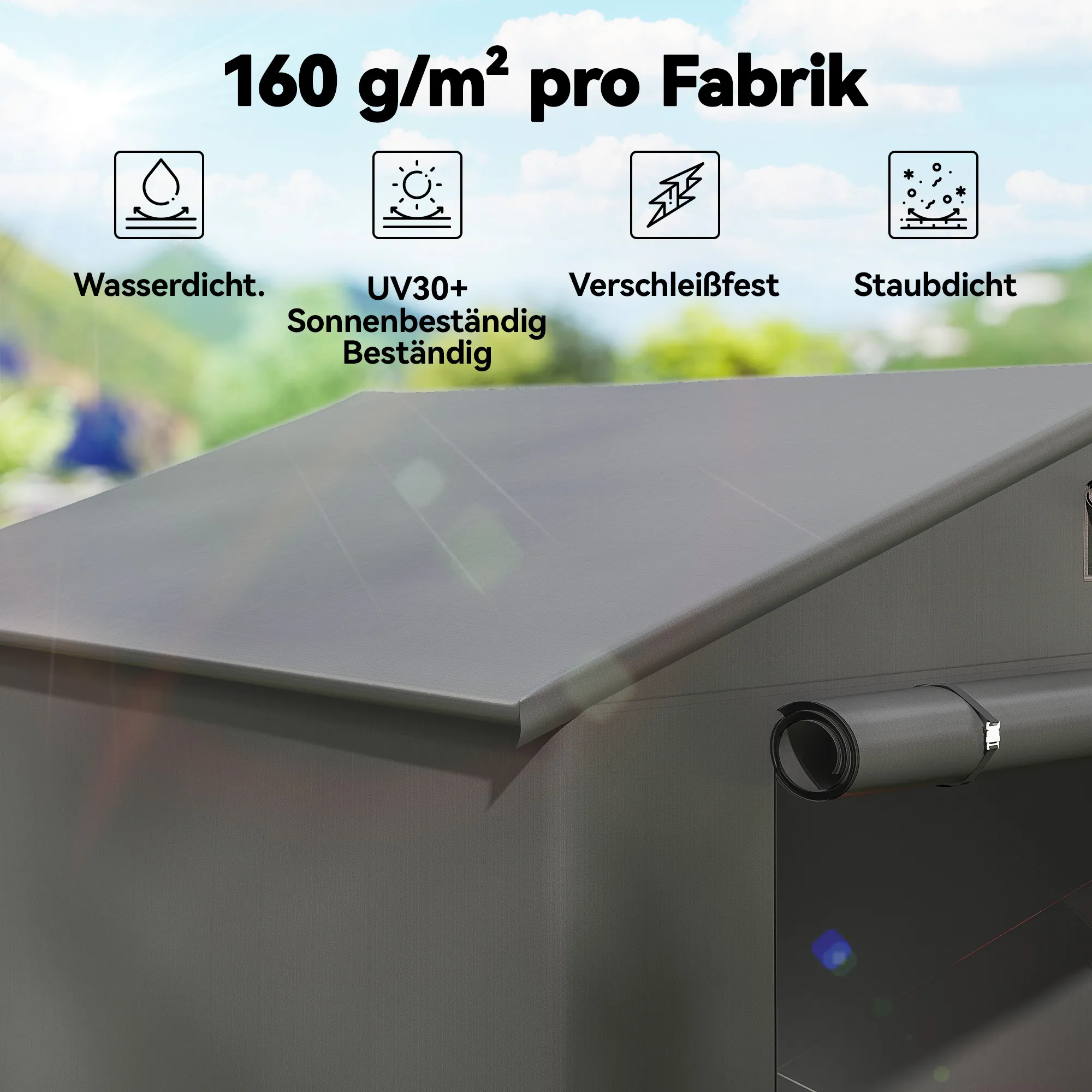 - Weerbestendig: Dik PE-zeil biedt waterdichtheid en UV30+ zonbescherming