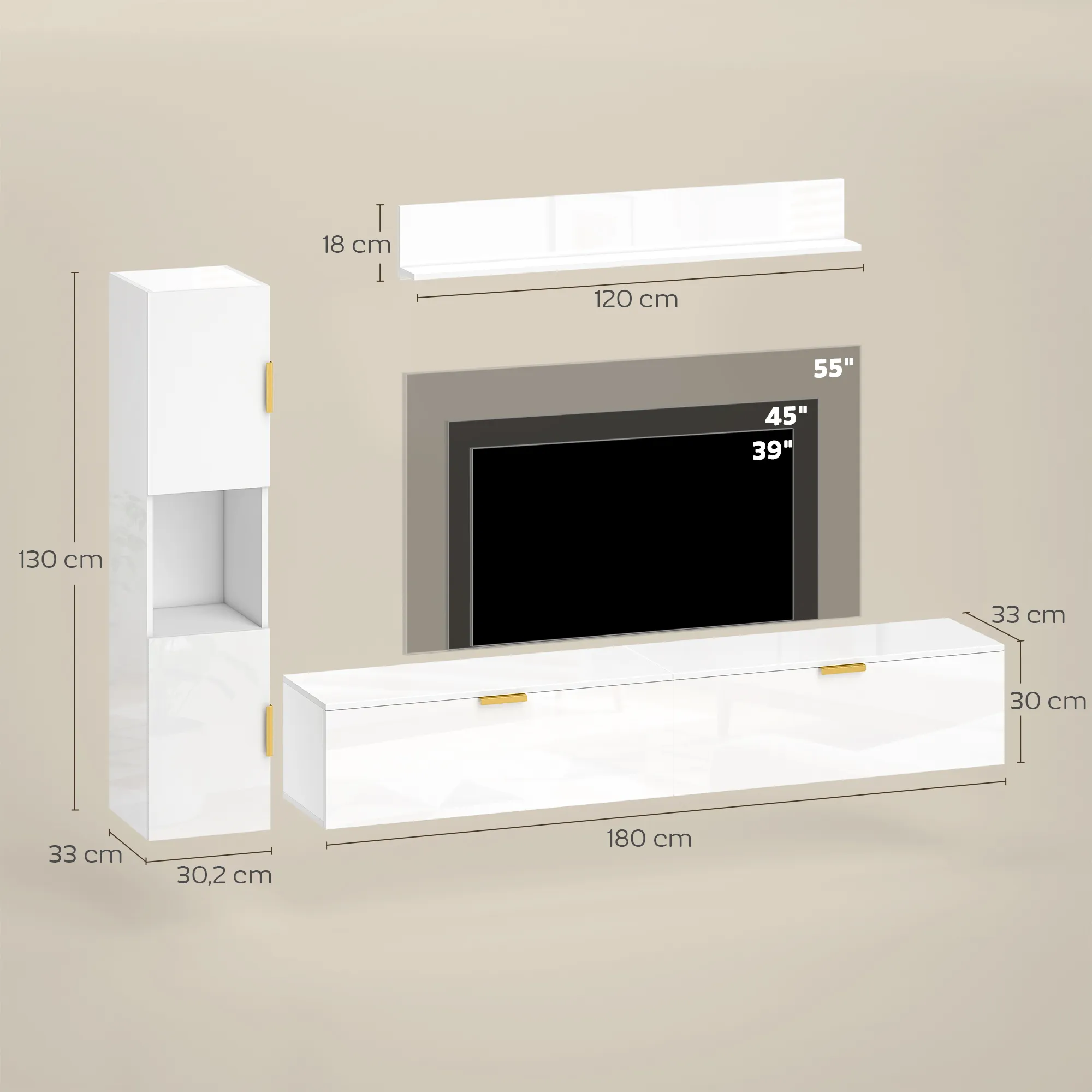 Zwevend TV-meubel Met Klapdeuren Entertainment Center Wandplank Kast 180 Cm Hoogglans Wit